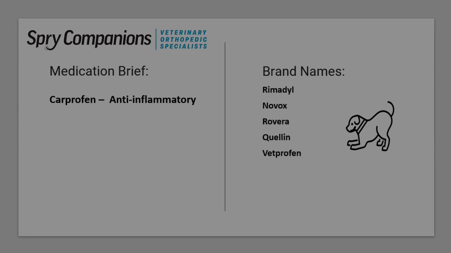 [Audio] This medication brief will highlight the benefits of Carprofen, commonly known by the brand name Rimmadyl). Carprofen is a non-steroidal anti-inflammatory drug (N S A I D) that is frequently prescribed for dogs to manage and relieve pain and inflammation. Carprofen is available under various brand names, with some of the most widely recognized including: (Rimmadyl) One of the most well-known and commonly prescribed brands of carprofen for dogs. (Novox) and (Rovera) Both a generic version of Carprofen's Rimmadyl. (Quellin) A soft chewable formulation of carprofen designed to be more palatable for dogs. (Vetprofen) A widely used brand that is specifically formulated for veterinary use..