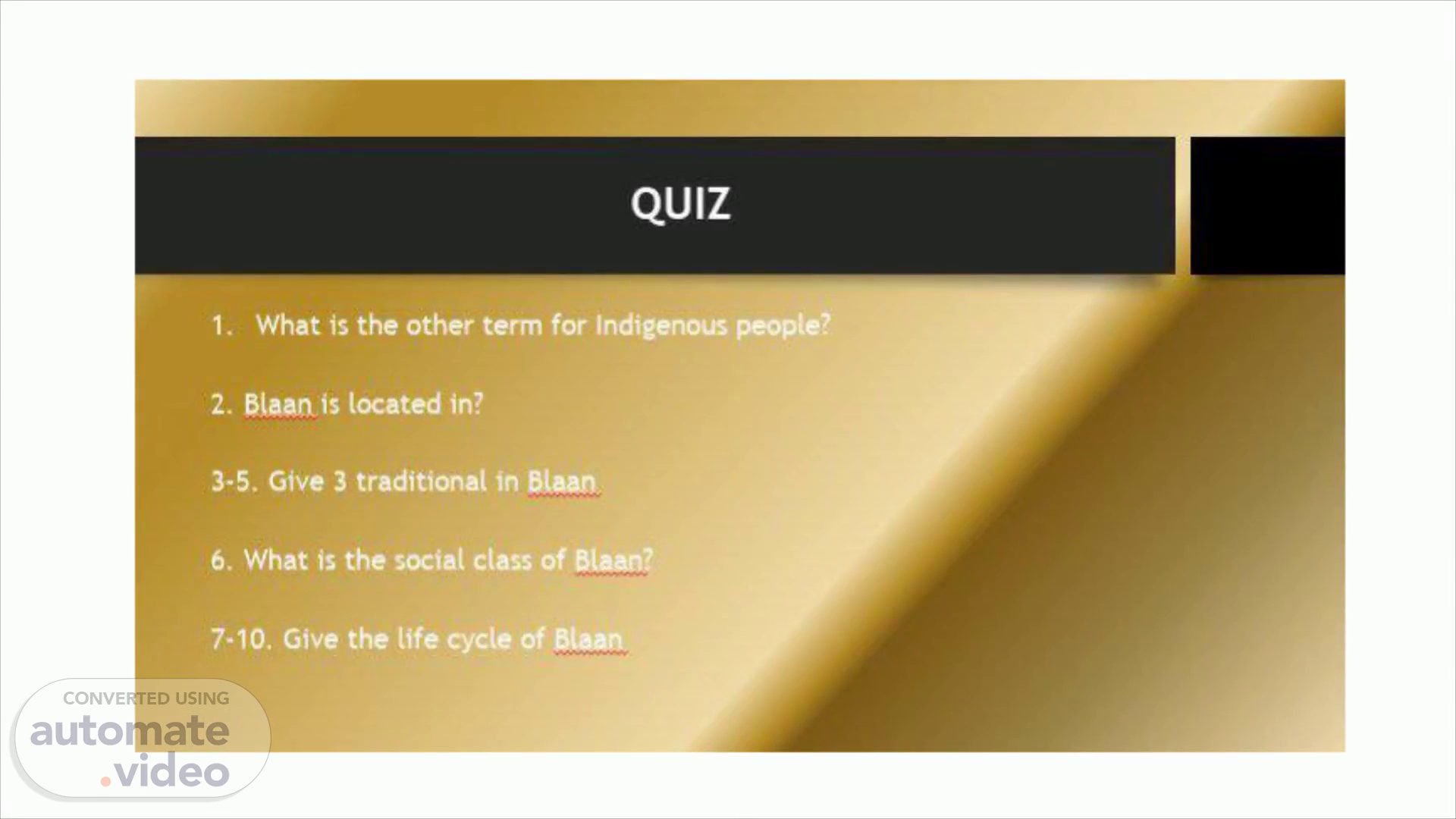 [Audio] 1. What is the other term for Indigenous People? 2. Blaan is located in? 3- 5. Give 3 traditional in Blaan? 6. What is the social class of Blaan? 7- 10. Give the life cycle of Blaan.