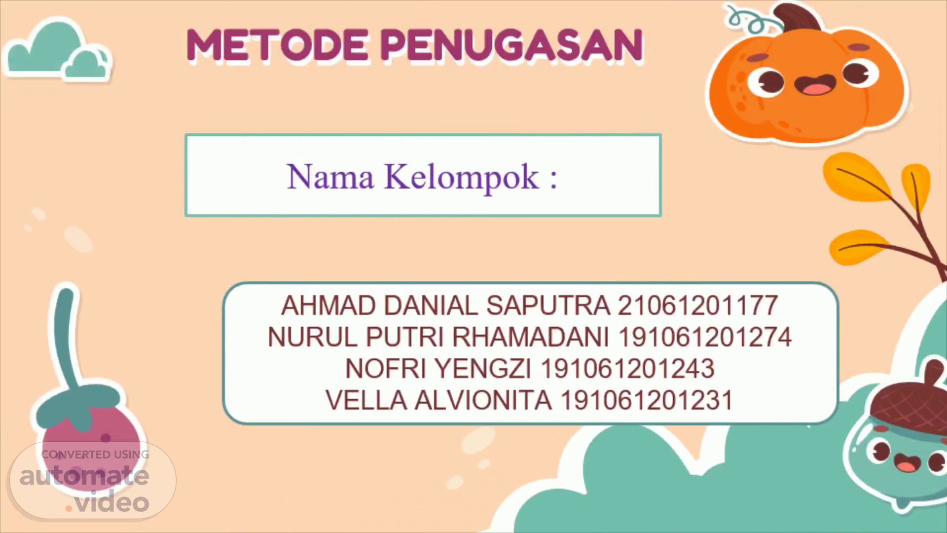METODE PENUGASAN. Nama Kelompok :. AHMAD DANIAL SAPUTRA 21061201177 NURUL PUTRI RHAMADANI 191061201274 NOFRI YENGZI 191061201243 VELLA ALVIONITA 191061201231.
