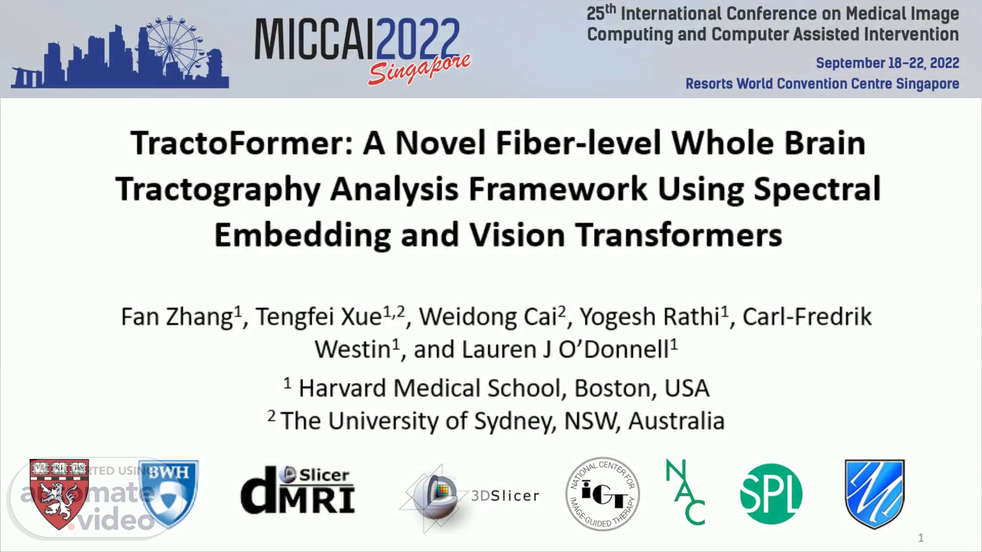 [Audio] Hello everyone, in this presentation, we will introduce our work on, TractoFormer, A Novel Fiber-level Whole Brain Tractography Analysis Framework Using Spectral Embedding and Vision Transformers..