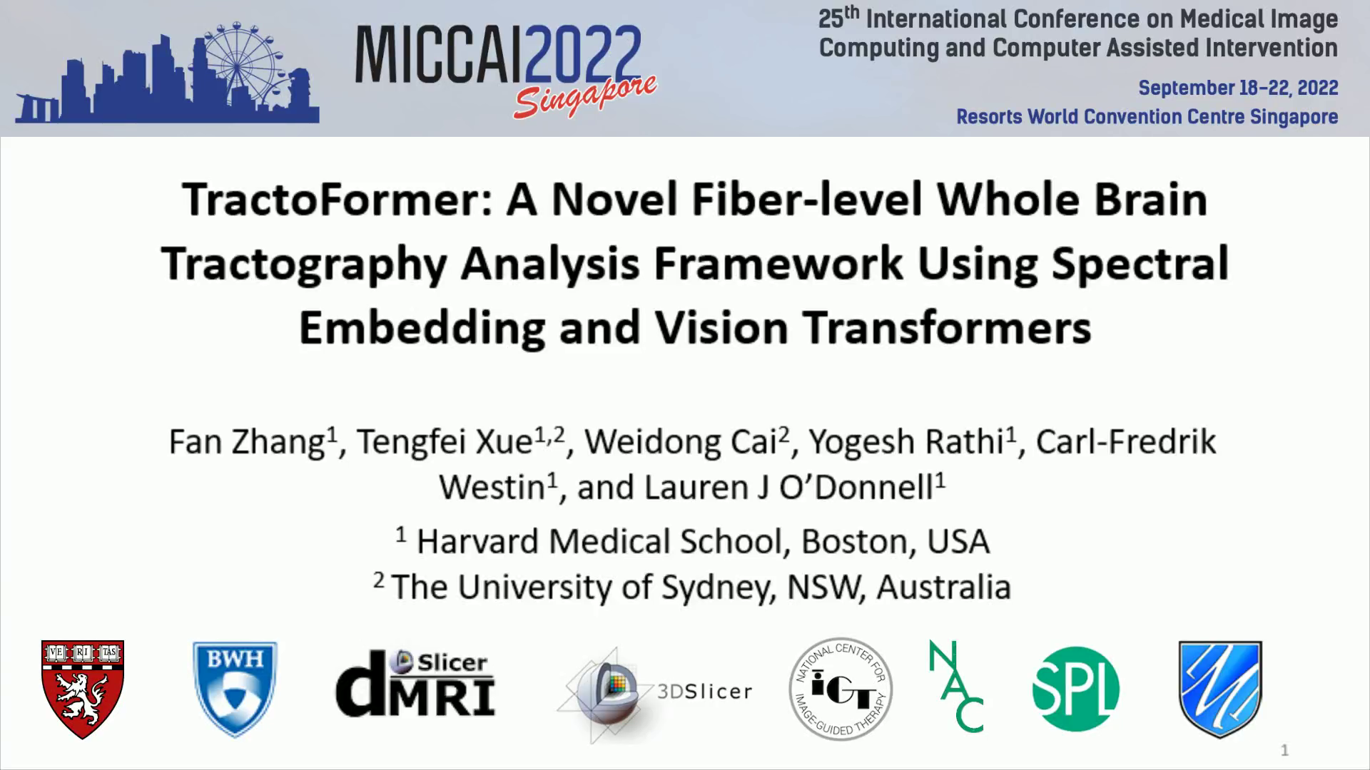 [Audio] Hello everyone, in this presentation, we will introduce our work on, TractoFormer, A Novel Fiber-level Whole Brain Tractography Analysis Framework Using Spectral Embedding and Vision Transformers..