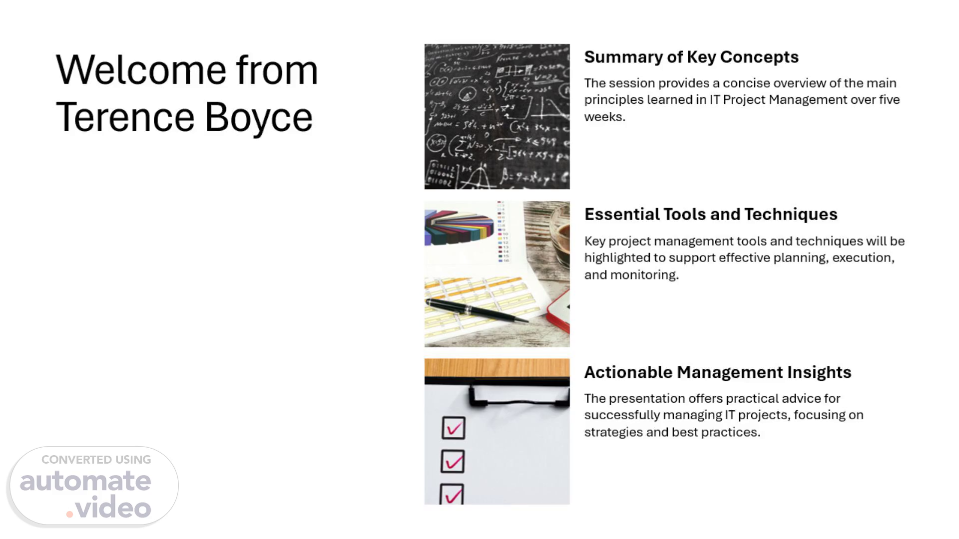 [Virtual Presenter] Image source: Microsoft 365 content library Hello, I’m Terence Boyce. Today’s date is 09/20/25. In this briefing, I’ll synthesize what I’ve learned over the past five weeks in IT Project Management, focusing on techniques, skills, and insights that are critical to successful project delivery..