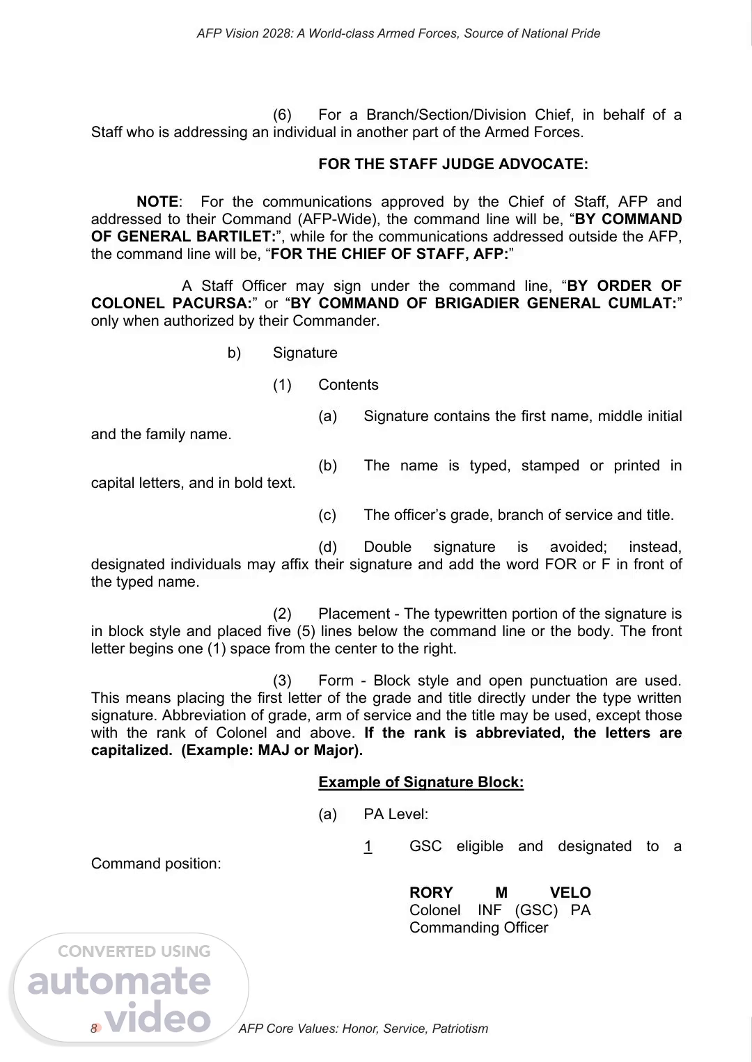 [Audio] A-F-P Vision 2028: A World-class Armed Forces, Source of National Pride A-F-P Vision 2028: A World-class Armed Forces, Source of National Pride (6) For a Branch/Section/Division Chief, in behalf of a Staff who is addressing an individual in another part of the Armed Forces. For THE STAFF judge ADVOCATE: NotE: For the communications approved by the Chief of Staff, A-F-P and addressed to their Command (AFP-Wide), the command line will be, “BY COMMAND OF GENERAL bartilet:”, while for the communications addressed outside the AFP, the command line will be, “For THE CHIEF OF STAFF, AFP:” A Staff Officer may sign under the command line, “BY ORDER OF COLONEL pacursa:” or “BY COMMAND OF BRIGADIER GENERAL CUMLAT:” only when authorized by their Commander. b) Signature (1) Contents (a) Signature contains the first name, middle initial and the family name. (b) The name is typed, stamped or printed in capital letters, and in bold text. (c) The officer’s grade, branch of service and title. (d) Double signature is avoided; instead, designated individuals may affix their signature and add the word For or F in front of the typed name. (2) Placement The typewritten portion of the signature is in block style and placed five (5) lines below the command line or the body. The front letter begins one (1) space from the center to the right. (3) Form Block style and open punctuation are used. This means placing the first letter of the grade and title directly under the type written signature. Abbreviation of grade, arm of service and the title may be used, except those with the rank of Colonel and above. If the rank is abbreviated, the letters are capitalized. (Example: M-A-J or Major). Example of Signature Block: (a) PA Level: 1 G-S-C eligible and designated to a Command position: rory M velo Colonel INF (G-S-C--) PA Commanding Officer A-F-P Core Values: Honor, Service, Patriotism 8 8 A-F-P Core Values: Honor, Service, Patriotism.
