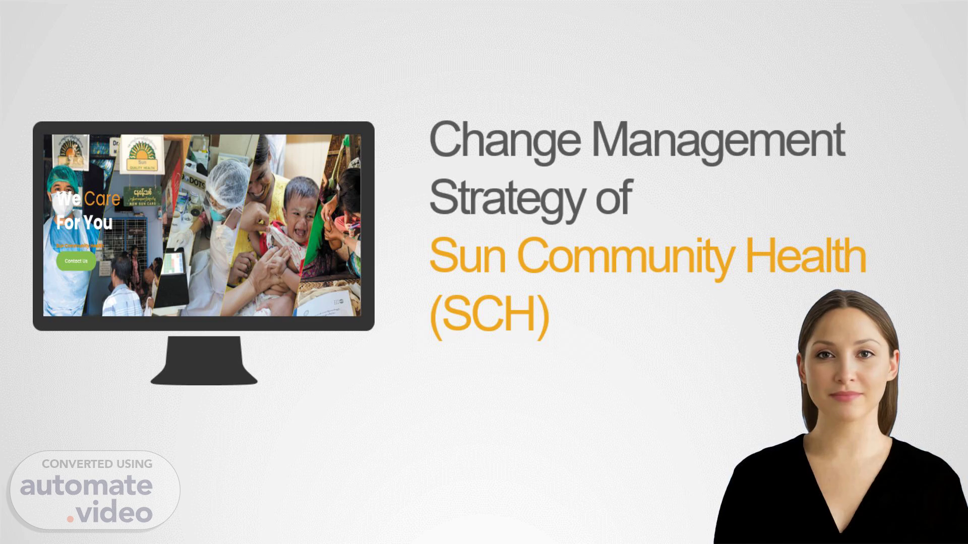 [Virtual Presenter] Good morning, everyone. I am here today to discuss our change management strategy of Sun Community Health (SCH). I will explain how our organization works to reduce mortality and morbidity, by educating communities on healthy behavior and providing access to appropriate and affordable healthcare services to those who need it most. Let's begin..
