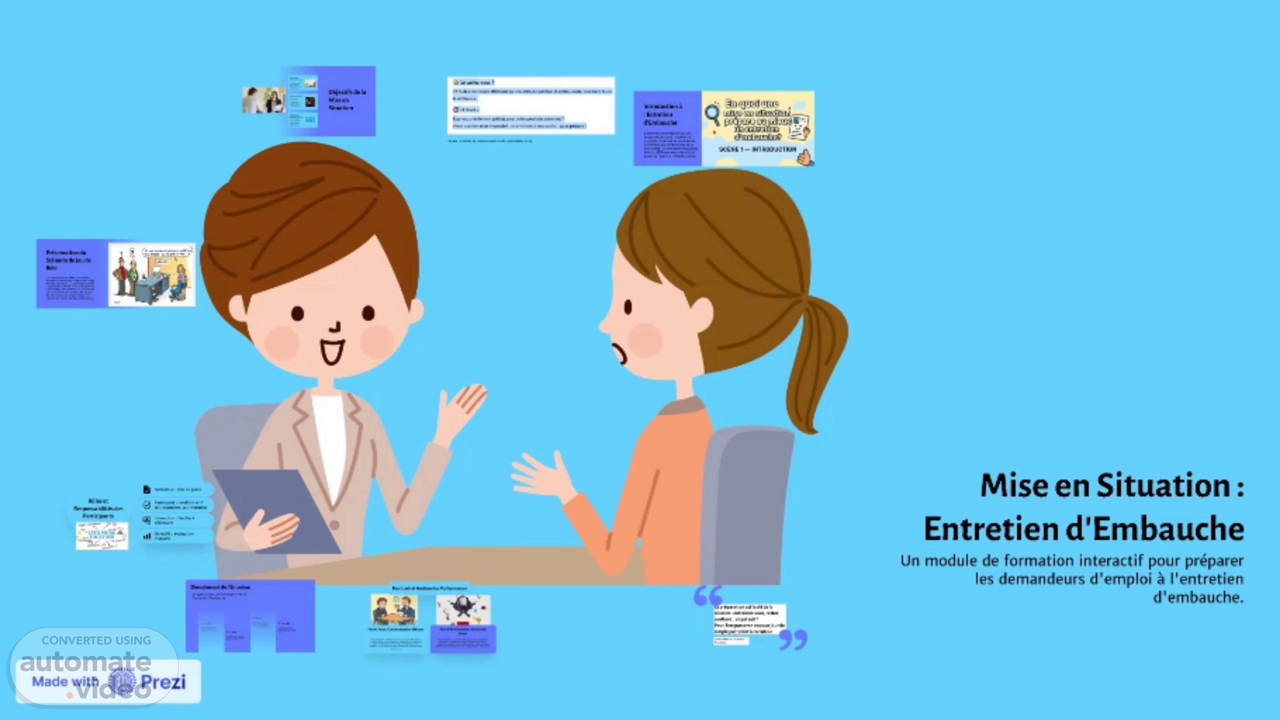 Obiectifs de la Situation Introduction I Entretien d 'Embauche Presentation du Scenario d. leu Wes Responsa b ilités des Made with prepare au m.eux un entretien d •embauche' SCtNE 1 — INTRODUCTION Mise en Situation : Entretien d'Embauche Un module de formation interactif pour préparer les demandeurs d'emploi å l'entretien d'embauche. Prezi.