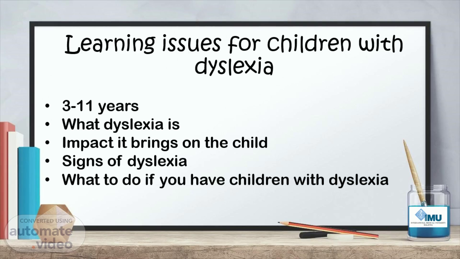 Learning issues for children with dyslexia. 3-11 years What dyslexia is Impact it brings on the child Signs of dyslexia What to do if you have children with dyslexia.