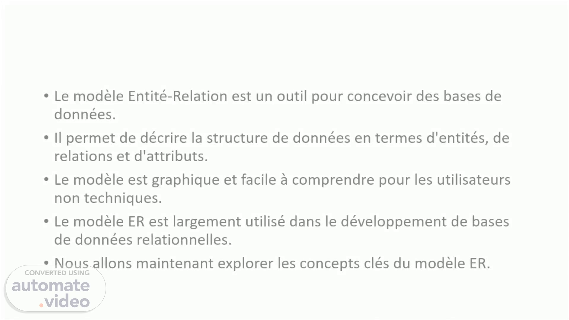 [Audio] Le modèle Entité-Relation est un outil graphique pour concevoir des bases de données relationnelles. Il permet de représenter les entités, les relations et les attributs de manière graphique, ce qui facilite la compréhension pour les utilisateurs non techniques. Le modèle ER est largement utilisé dans l'industrie pour concevoir des bases de données. Dans ce cours, nous allons explorer les concepts clés du modèle ER, tels que les entités, les relations, les attributs, les clés primaires et étrangères, les cardinalités, les associations et la normalisation..