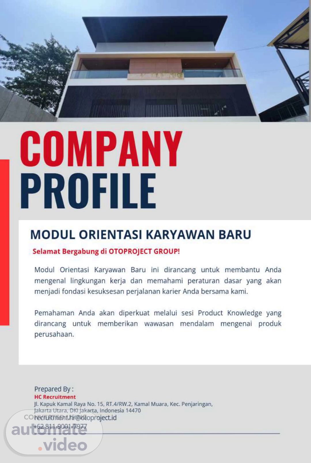 COMPANY PROFILE MODUL ORIENTASI KARYAWAN BARU Selamat Bergabung di OTOPROJECT GROUP! Modul Orientasi Karyawan Baru ini dirancang untuk membantu Anda mengenal lingkungan kerja dan memahami peraturan dasar yang akan menjadi fondasi kesuksesan perjalanan karier Anda bersama kami. Pemahaman Anda akan diperkuat melalui sesi Product Knowledge yang dirancang untuk memberikan wawasan mendalam mengenai produk perusahaan. Prepared By : HC Recruitment Jl. Kapuk Kamal Raya No. 15, RT.4/RW.2, Kamal Muara, Kec. Penjaringan, Jakarta Utara, DKI Jakarta, Indonesia 14470 [email protected] +62811-9001-7977.