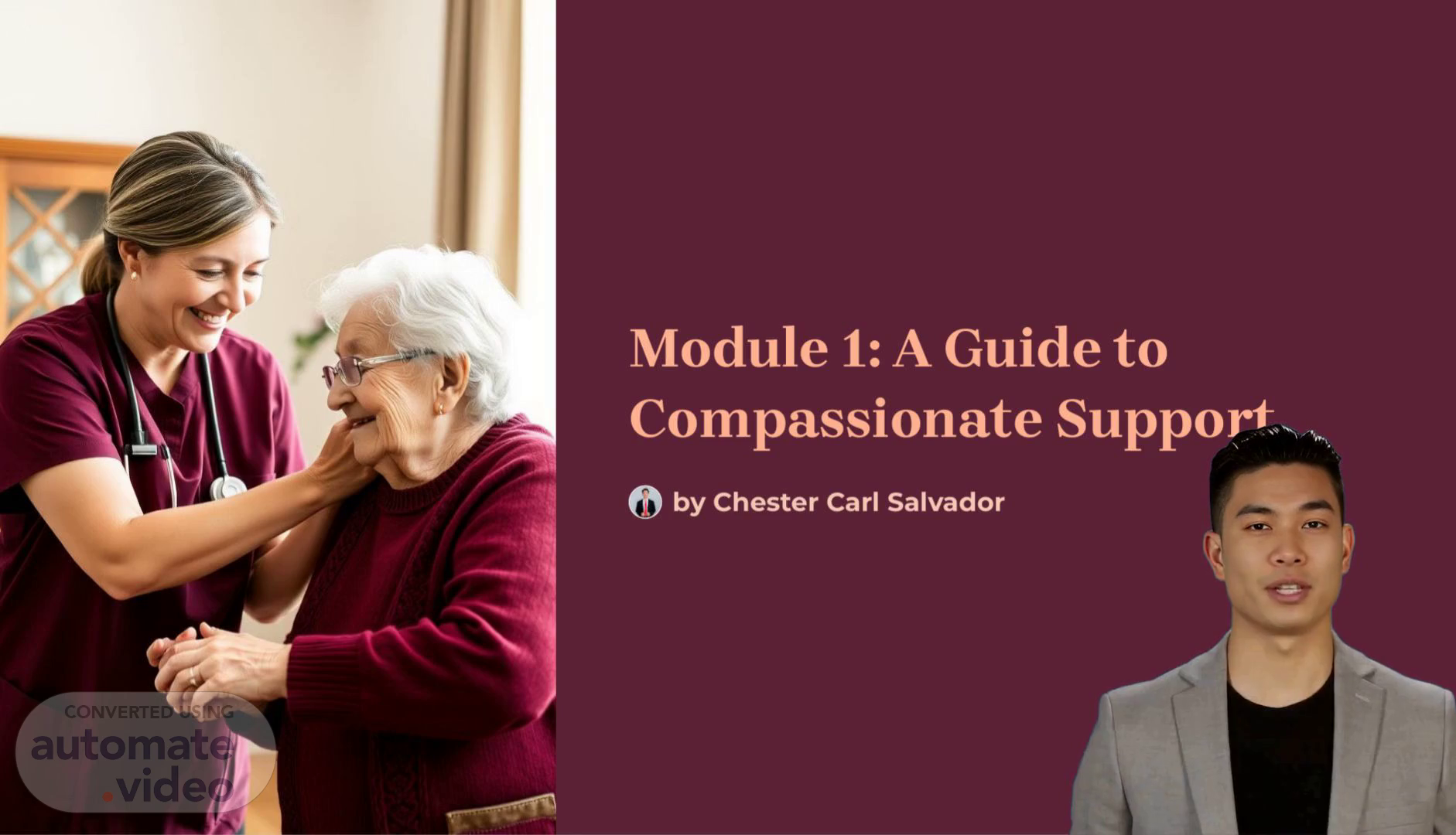 [Virtual Presenter] Welcome to Module 1 of our training video series, 'A Guide to Compassionate Support' presented by Chester Carl Salvador. This series will teach you the necessary skills and techniques for providing compassionate support to those in need. In this first module, we will establish the fundamentals of compassionate support, laying the groundwork for the remaining modules in the series. Let's begin learning how to offer sincere care and empathy to those who require it. We appreciate your participation..