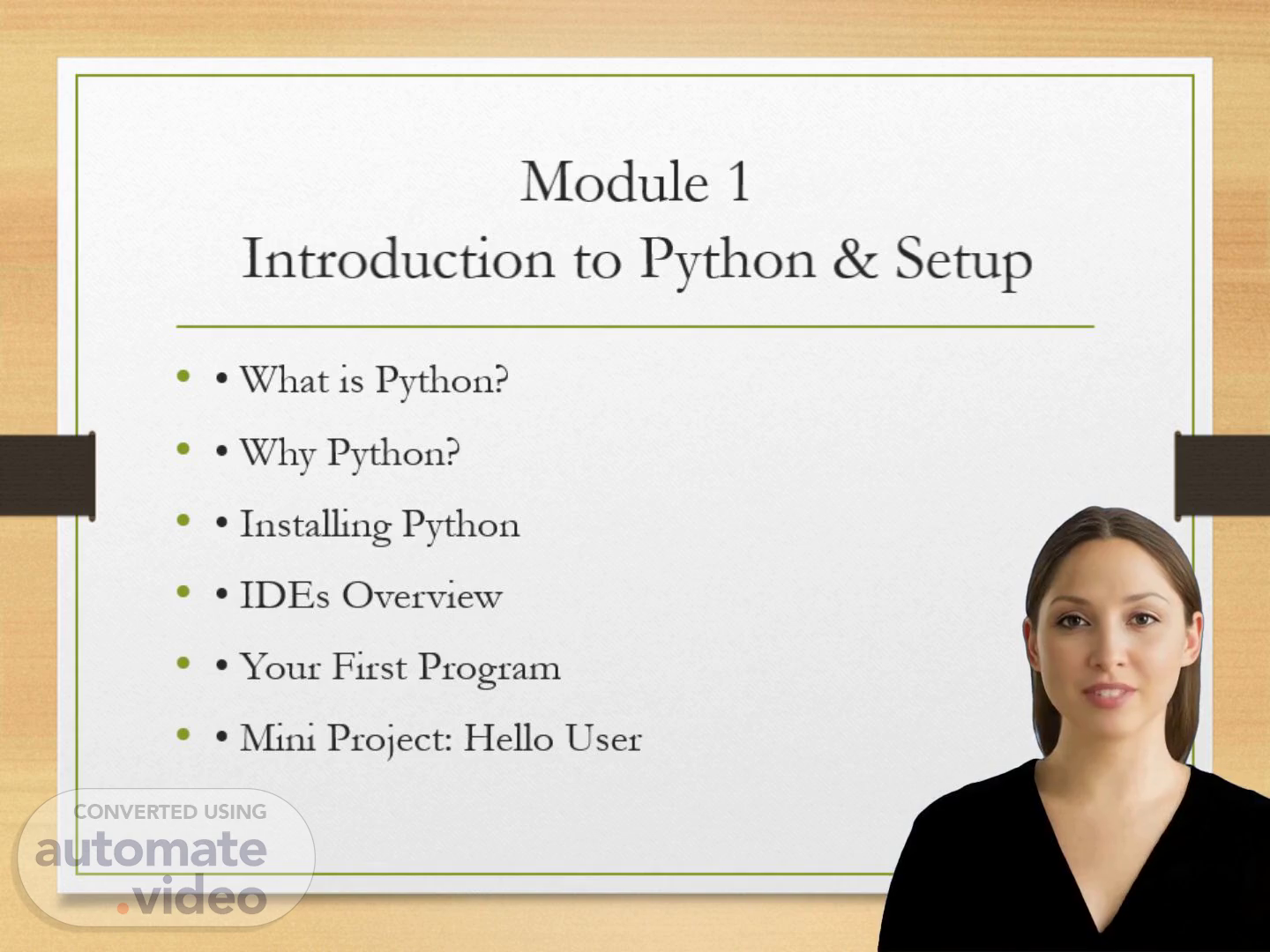 [Virtual Presenter] Module 1 Introduction to Python & Setup What is Python? Why Python? Installing Python IDEs Overview Your First Program Mini Project: Hello User.