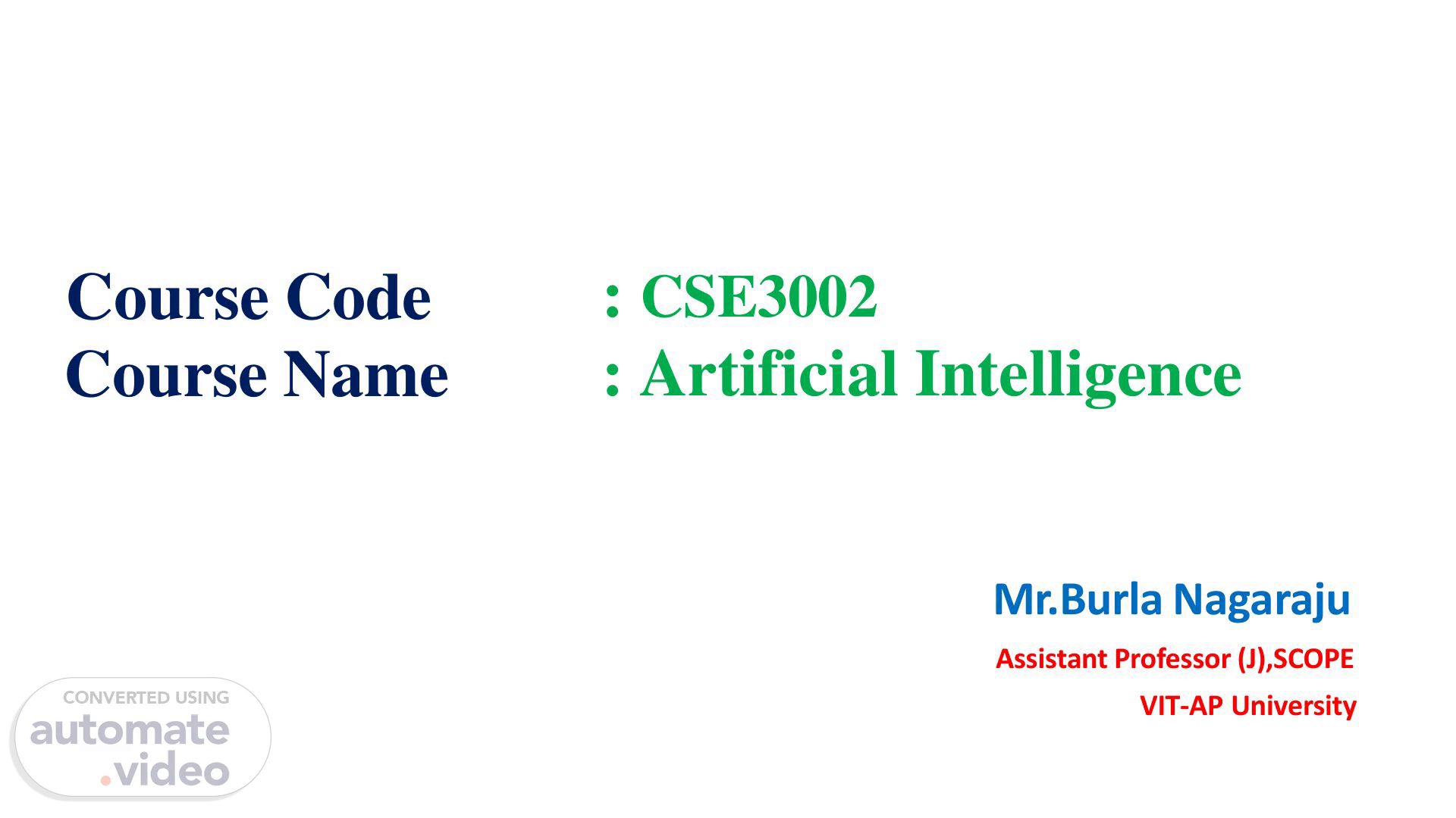 Course Code Course Name : CSE3002 : Artificial Intelligence Mr.Burla Nagaraju Assistant Professor (J),SCOPE VIT-AP University.