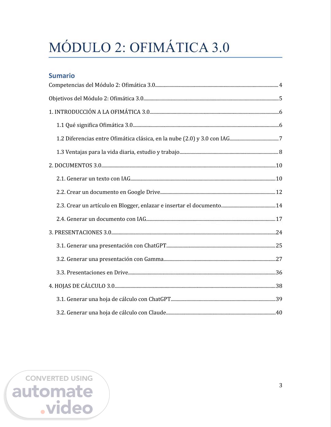 [Audio] "El módulo se enfoca en el desarrollo de habilidades en la creación de documentos, presentaciones y hojas de cálculo en formato digital. Aprenderás a utilizar herramientas digitales para crear contenido visualmente atractivo y efectivo. La formación te permitirá trabajar con diferentes tipos de software y aplicaciones, como Microsoft Office y Google Workspace.