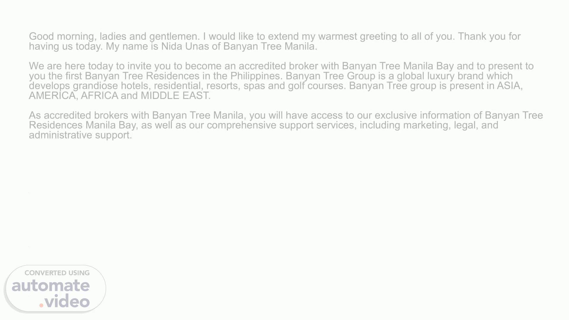 [Virtual Presenter] Good morning, ladies and gentlemen. I would like to extend my warmest greeting to all of you. Thank you for having us today. My name is Nida Unas of Banyan Tree Manila. We are here today to invite you to become an accredited broker with Banyan Tree Manila Bay and to present to you the first Banyan Tree Residences in the Philippines. Banyan Tree Group is a global luxury brand which develops grandiose hotels, residential, resorts, spas and golf courses. Banyan Tree group is present in ASIA, AMERICA, AFRICA and MIDDLE EAST. As accredited brokers with Banyan Tree Manila, you will have access to our exclusive information of Banyan Tree Residences Manila Bay, as well as our comprehensive support services, including marketing, legal, and administrative support. We believe that Banyan Tree Residences Manila Bay represents an exceptional investment opportunity for your clients who are looking for a high-end property that offers strong potential for appreciation and rental income. The location is in the heart of Manila Bay, combined with the exclusivity and luxury of the development, makes it a highly sought-after property that is expected to appreciate in value over time. And the luxurious facilities, water features, amenities and prime location make it an attractive option for high-end renters, providing your clients with the potential for strong rental income. Banyan Tree Manila Bay is the most exquisite property located in Macapagal Manila and has the highest capital appreciation among the cities in the Philippines. The country has been declared the fastest growing economy in Asia, making it a prime destination for expanding business opportunities for expat investors. Manila is a top tourist destination, offering unforgettable experiences and memories for every family. Now, let's dive into the details of Banyan Tree Residences Manila Bay. Here's the video ... Thank you very much. Allow me to introduce Ms. Alex, our project manager Trainor. She will briefly be presenting Banyan Tree Manila - the project..