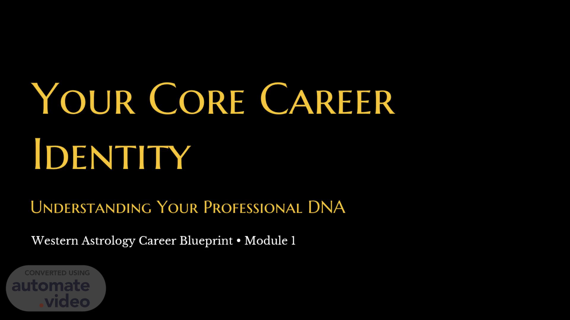 [Audio] Welcome to the first module of your Western Astrology Career Blueprint. In this session, we're going to explore the foundation of who you are professionally. Not what job you should have — that comes later. First, we need to understand your core identity. The raw material you're working with. Think of this like understanding your operating system before you install any programs. Your career choices work best when they align with how you're naturally wired. By the end of this module, you'll understand three things: your Sun sign, which shows your core professional identity; your Moon sign, which reveals what you need to feel fulfilled at work; and your Rising sign, which shapes how others perceive you professionally. Let's start with what Western astrology actually shows us about career..