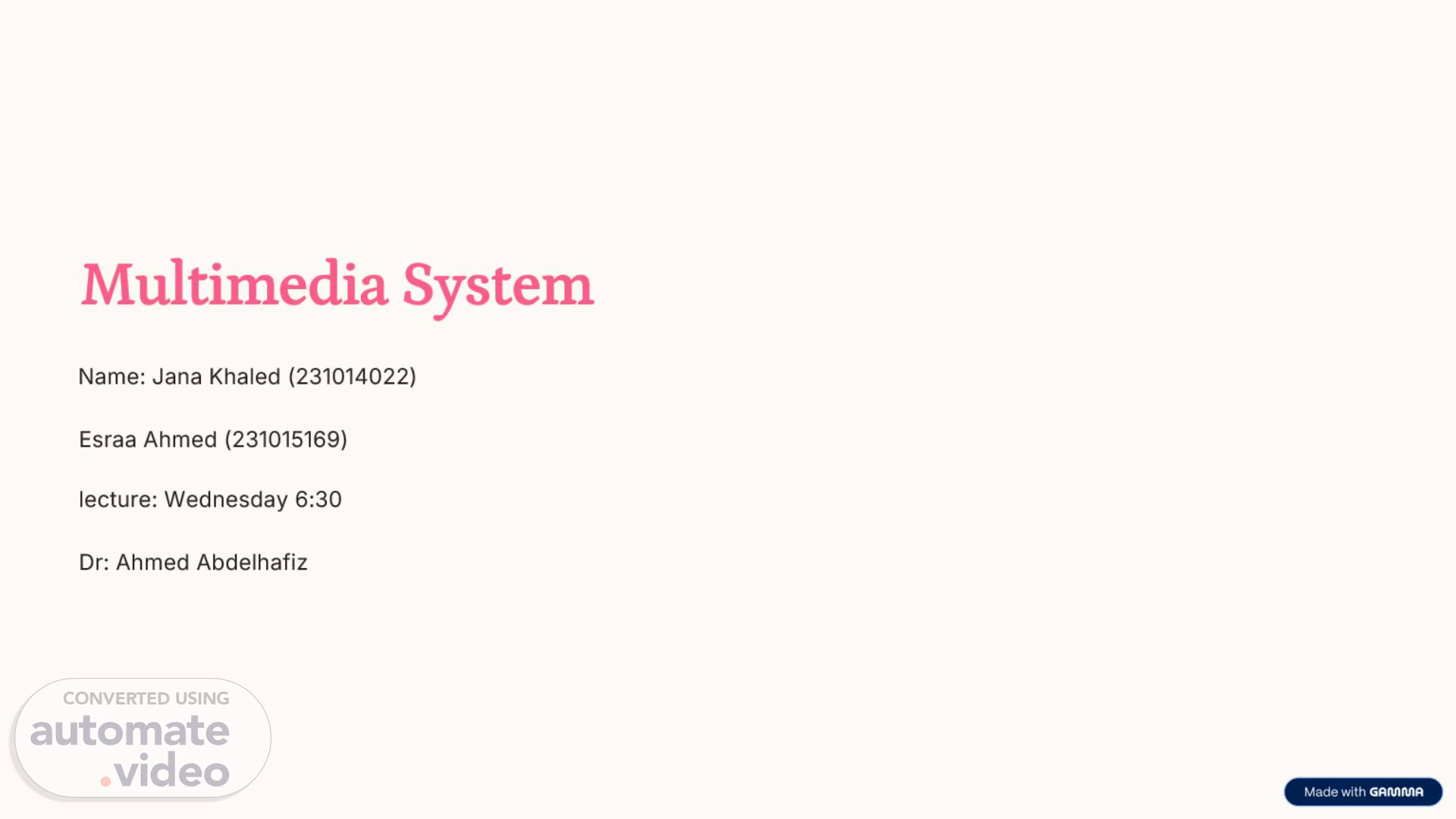 [Audio] "Welcome to our presentation on Multimedia Systems. Prepared by Jana Khaled and Esraa Ahmed, under the guidance of Dr. Ahmed Abdelhafiz.".