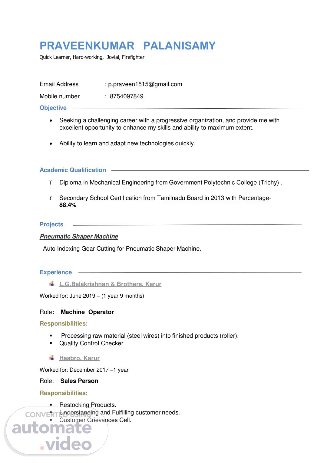 [Audio] PRAVEENKUMAR PALANISAMY Quick Learner, Hard-working, Jovial, Firefighter Email Address : [email protected] Mobile number : 8754097849 Objective Seeking a challenging career with a progressive organization, and provide me with excellent opportunity to enhance my skills and ability to maximum extent. Ability to learn and adapt new technologies quickly. Academic Qualification Diploma in Mechanical Engineering from Government Polytechnic College (Trichy) . Secondary School Certification from Tamilnadu Board in 2013 with Percentage- 88.4% Projects Pneumatic Shaper Machine Auto Indexing Gear Cutting for Pneumatic Shaper Machine. Experience L.G.Balakrishnan & Brothers, Karur Worked for: June 2019 – (1 year 9 months) Role: Machine Operator Responsibilities: Processing raw material (steel wires) into finished products (roller). Quality Control Checker Hasbro, Karur Worked for: December 2017 –1 year Role: Sales Person Responsibilities: Restocking Products. Understanding and Fulfilling customer needs. Customer Grievances Cell..