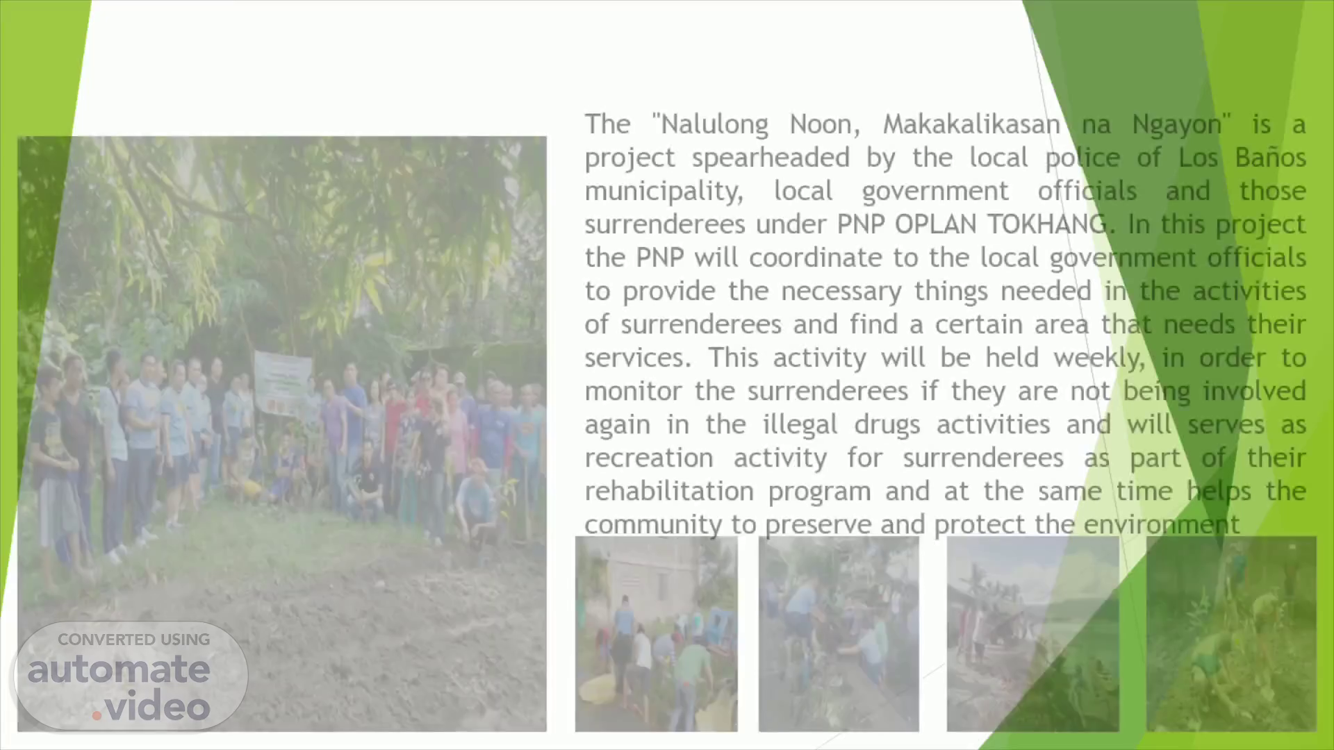 [Audio] The "Nalulong Noon, Makakalikasan na Ngayon" is a project spearheaded by the local police of Los Baños municipality, local government officials and those surrenderees under PNP OPLAN TOKHANG. In this project the PNP will coordinate to the local government officials to provide the necessary things needed in the activities of surrenderees and find a certain area that needs their services. This activity will be held weekly, in order to monitor the surrenderees if they are not being involved again in the illegal drugs activities and will serves as recreation activity for surrenderees as part of their rehabilitation program and at the same time helps the community to preserve and protect the environment.