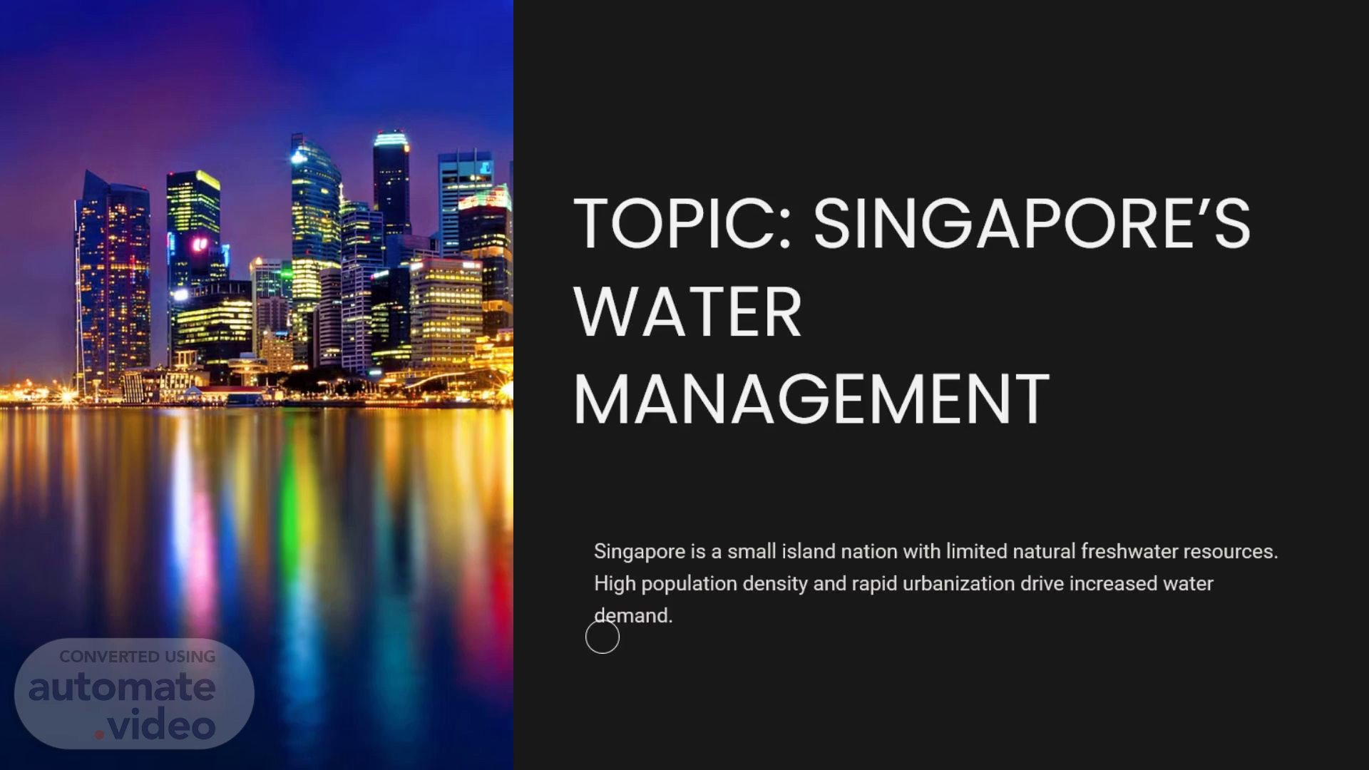 [Audio] Hello I am vishwas from M-C-A today I am presenting topic: singapore'S water management Singapore is a small island nation with limited natural freshwater resources. High population density and rapid urbanization drive increased water demand..