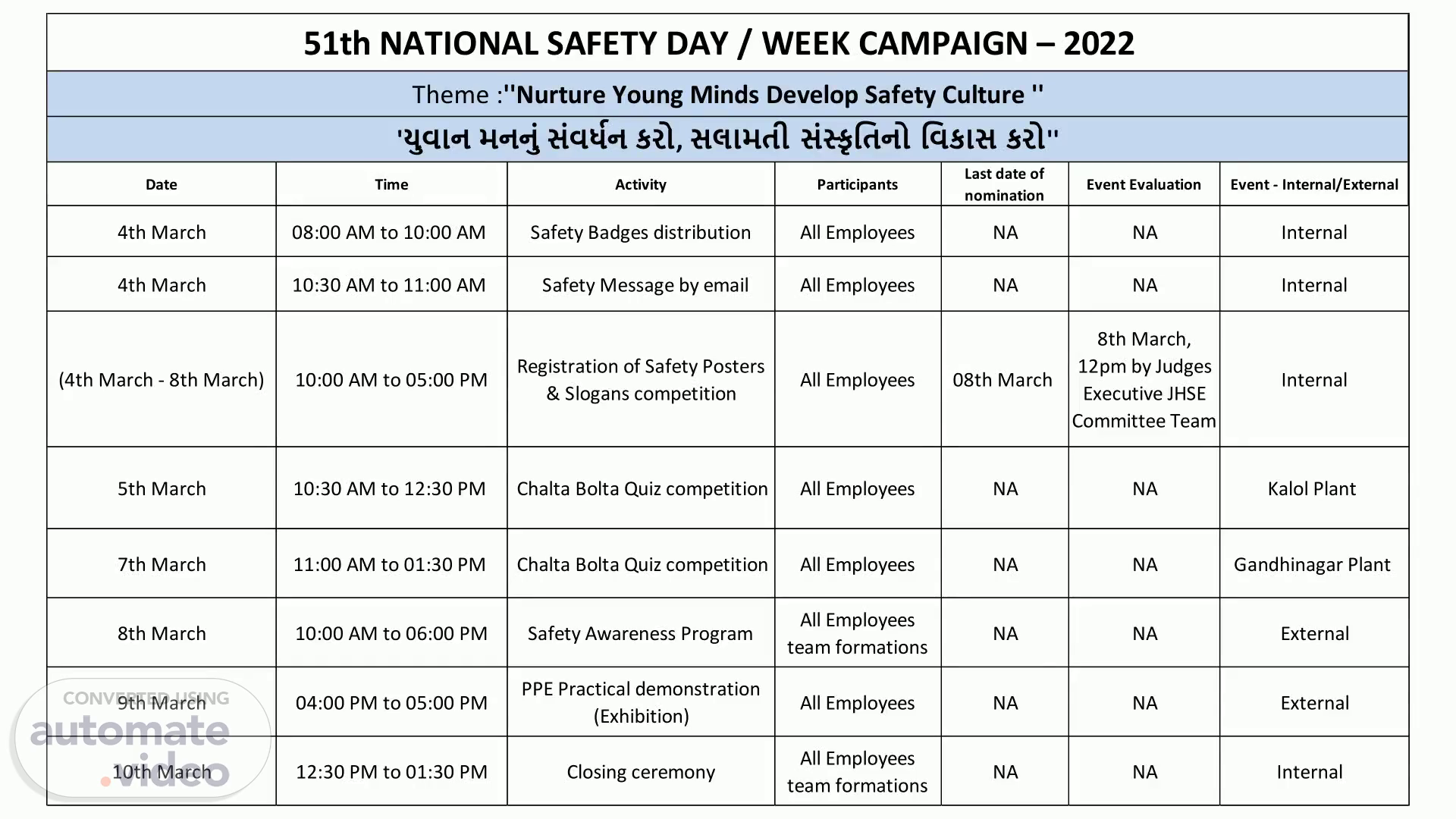 [Audio] Date Time Activity Participants Last date of nomination Event Evaluation Event - Internal/External 4th March 08: 00 AM to 10:00 AM Safety Badges distribution All Employees NA NA Internal 4th March 10:30 AM to 11:00 AM Safety Message by email All Employees NA NA Internal ( 4th March - 8th March) 10:00 AM to 05:00 PM Registration of Safety Posters & Slogans competition All Employees 08th March 8th March, 12pm by Judges Executive JHSE Committee Team Internal 5th March 10:30 AM to 12:30 PM Chalta Bolta Quiz competition All Employees NA NA Kalol Plant 7th March 11:00 AM to 01:30 PM Chalta Bolta Quiz competition All Employees NA NA Gandhinagar Plant 8th March 10:00 AM to 06:00 PM Safety Awareness Program All Employees team formations NA NA External 9th March 04:00 PM to 05:00 PM PPE Practical demonstration ( Exhibition) All Employees NA NA External 10th March 12:30 PM to 01: 30 PM Closing ceremony All Employees team formations NA NA Internal 51th NATIONAL SAFETY DAY / WEEK CAMPAIGN – 2022 Theme :'' Nurture Young Minds Develop Safety Culture '' ' યુવાન મનનું સુંવર્ધન કરો, સલામતી સુંસ્કૃતતનો તવકાસ કરો''.