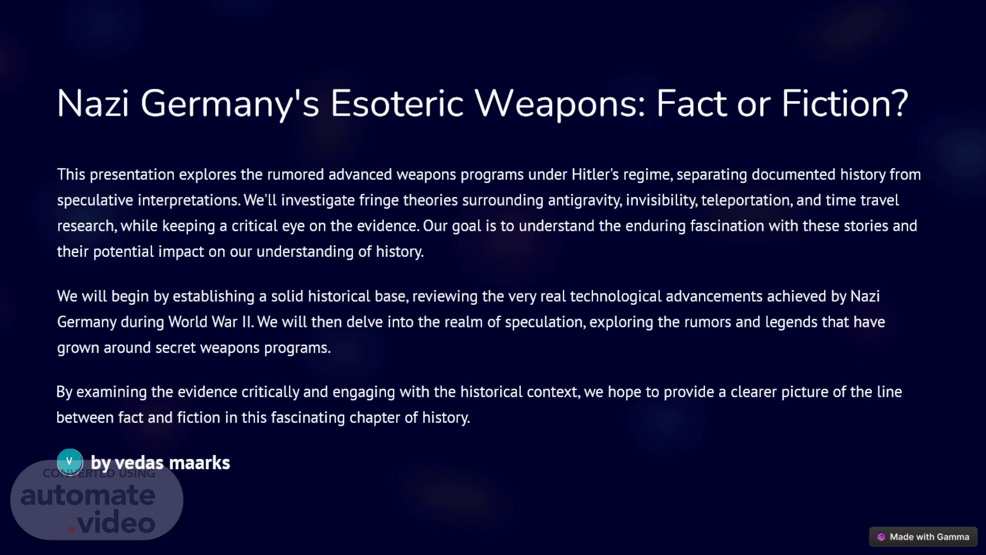 [Audio] Nazi Germany's Esoteric Weapons: Fact or Fiction? This presentation explores the rumored advanced weapons programs under Hitler's regime, separating documented history from speculative interpretations. We'll investigate fringe theories surrounding antigravity, invisibility, teleportation, and time travel research, while keeping a critical eye on the evidence. Our goal is to understand the enduring fascination with these stories and their potential impact on our understanding of history. We will begin by establishing a solid historical base, reviewing the very real technological advancements achieved by Nazi Germany during World War 2. We will then delve into the realm of speculation, exploring the rumors and legends that have grown around secret weapons programs. By examining the evidence critically and engaging with the historical context, we hope to provide a clearer picture of the line between fact and fiction in this fascinating chapter of history. by vedas maarks.
