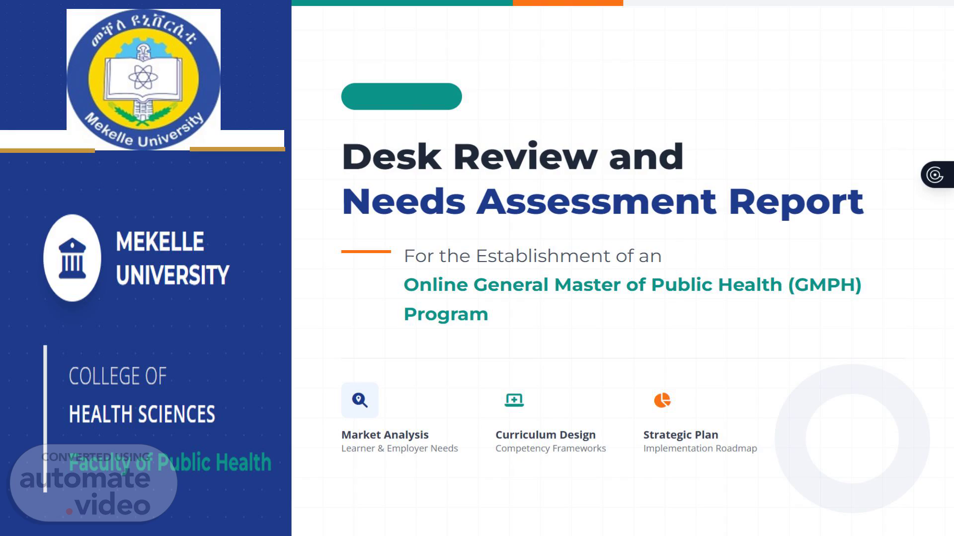 Desk Review and o Needs Assessment Report For the Establishment of an Online General Master of Public Health (GMPH) Program Market Analysis Learner & Employer Needs Curriculum Design Competency Frameworks Strategic Plan Implementation Roadmap.