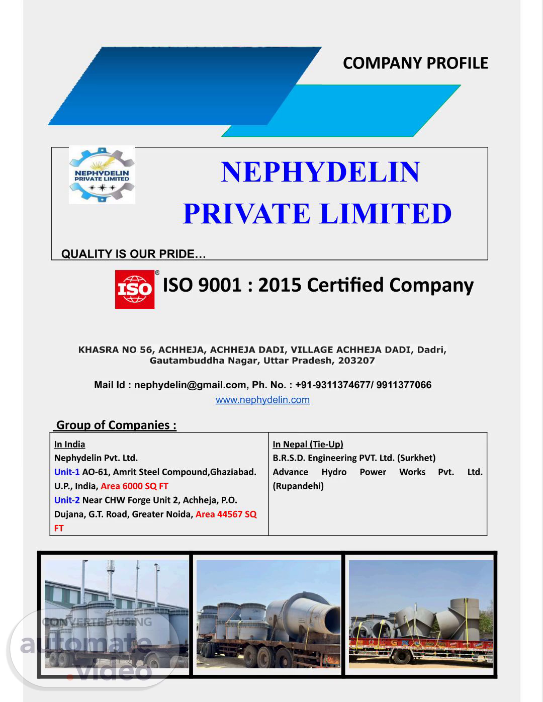 NEPHVDELIN PRIVATE LIMITED COMPANY PROFILE NEPHYDELIN PRIVATE LIMITED QUALITY IS OUR PRIDE... ISO 9001 : 2015 Certified Company KHASRA NO 56, ACHHEJA, ACHHEJA DADI, VILLAGE ACHHEJA DADI, Dadri, Gautambuddha Nagar, Uttar Pradesh, 203207 Mail ld : [email protected], Ph. No. : +91-9311374677/ 9911377066 www.nephydelin.com Group of Companies : In India Nephydelin Pvt. Ltd. Unit-I AO-61, Amrit Steel Compound,Ghaziabad. U.P., India, Area 6000 SQ FT Unit-2 Near CHW Forge Unit 2, Achheja, P.O. Dujana, G.T. Road, Greater Noida, Area 44567 SQ FT In Nepal (Tie-Up) B.R.S.D. Engineering PVT. Ltd. (Surkhet) Advance Hydro Power Works Pvt. (Rupandehi) Ltd..