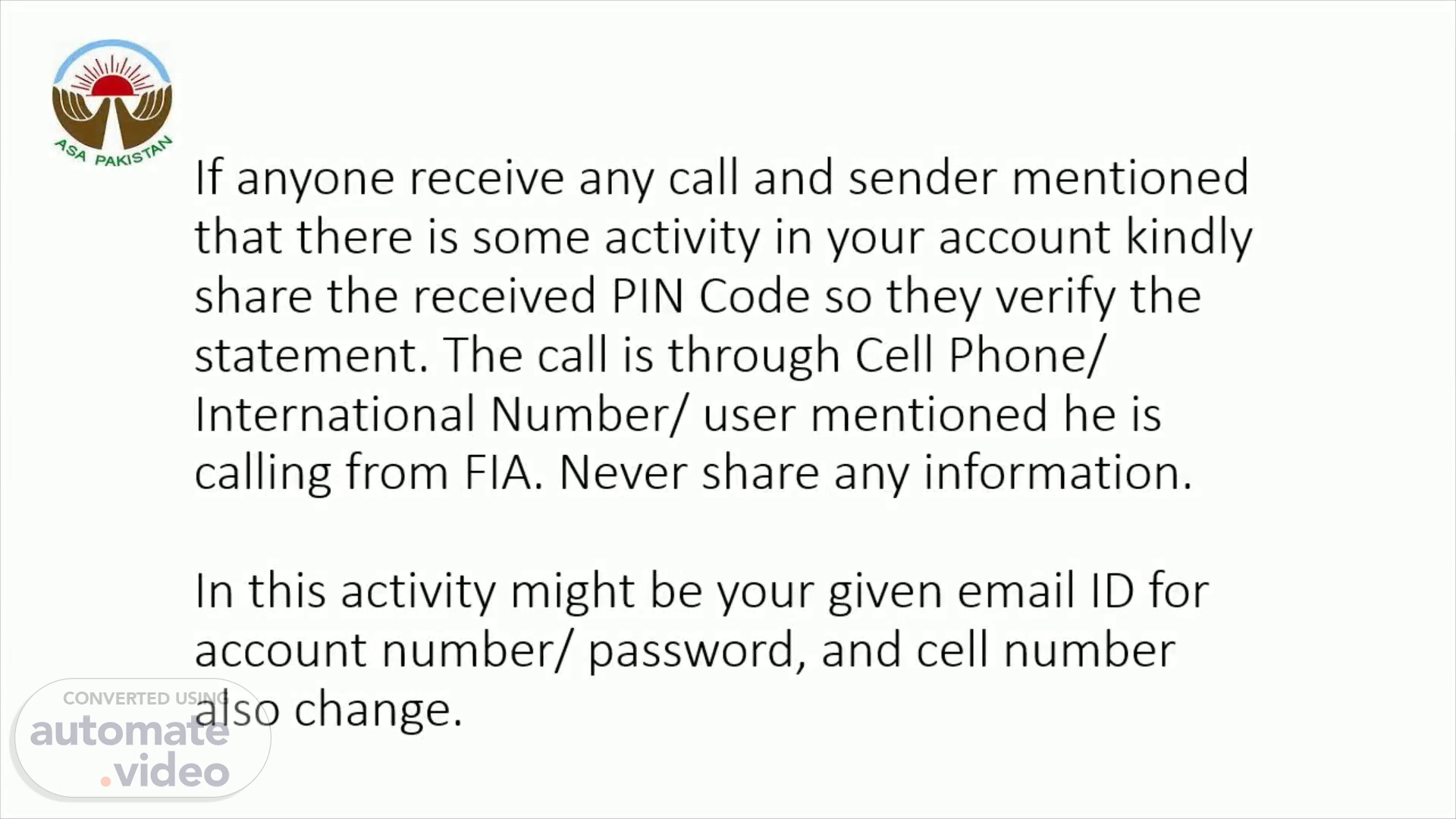 If anyone receive any call and sender mentioned that there is some activity in your account kindly share the received PIN Code so they verify the statement. The call is through Cell Phone/ International Number/ user mentioned he is calling from FIA. Never share any information. In this activity might be your given email ID for account number/ password, and cell number also change..