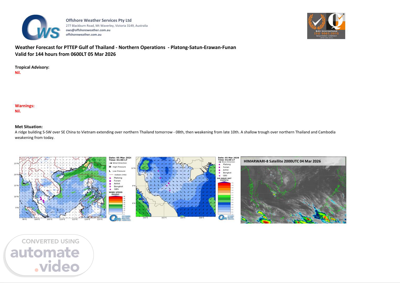 Offshore Weather Services Pty Ltd 277 Blackburn Road, Mt Waverley, Victoria 3149, Australia [email protected] offshoreweather.com.au Weather Forecast for PTTEP Gulf of Thailand - Northern Operations - Platong-Satun-Erawan-Funan Valid for 144 hours from 0600LT 05 Mar 2026 Met Situation: Tropical Advisory: Nil. Warnings: Nil. A ridge building S-SW over SE China to Vietnam extending over northern Thailand tomorrow - 08th, then weakening from late 10th. A shallow trough over northern Thailand and Cambodia weakening from today. HIMARWARI-8 Satellite 2000UTC 04 Mar 2026.
