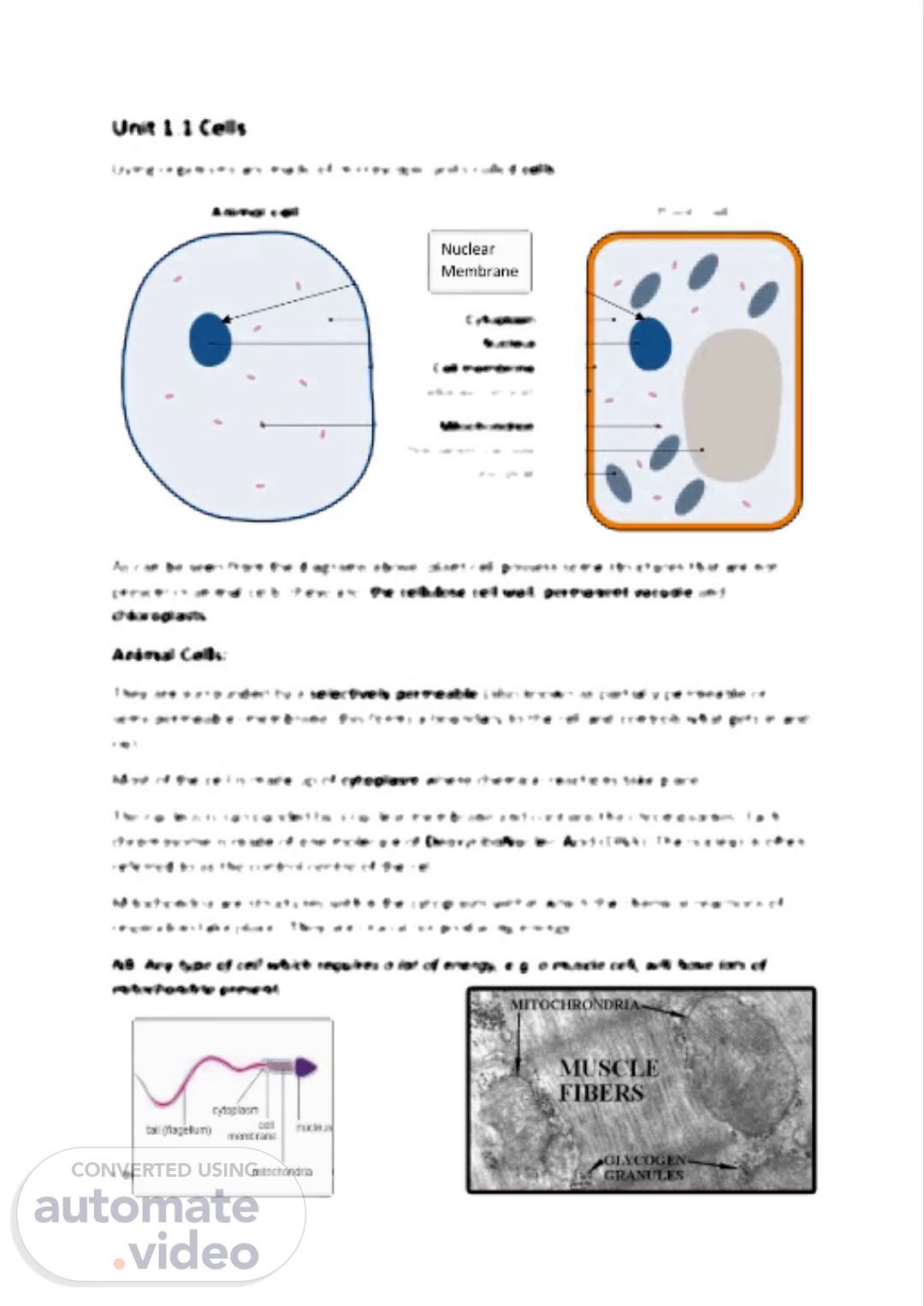 [Audio] Cells are the smallest components that make up all living organisms. They are divided into two categories: plant cells and animal cells. Plant cells have a cellulose cell wall a permanent vacuole and chloroplasts while animal cells are enclosed by a selectively permeable membrane and consists of a nucleus cytoplasm and mitochondria. The size of a cell is important as it relates to the amount of oxygen and other substances needed for its reactions. The larger the cell the more oxygen required but too big of a cell will not have enough surface area to allow the necessary oxygen to enter. This is why single celled organisms are small and multicellular ones rely on gas exchange organs like lungs and a system like the circulatory system to deliver oxygen. This knowledge helps us to better understand life and physiology..