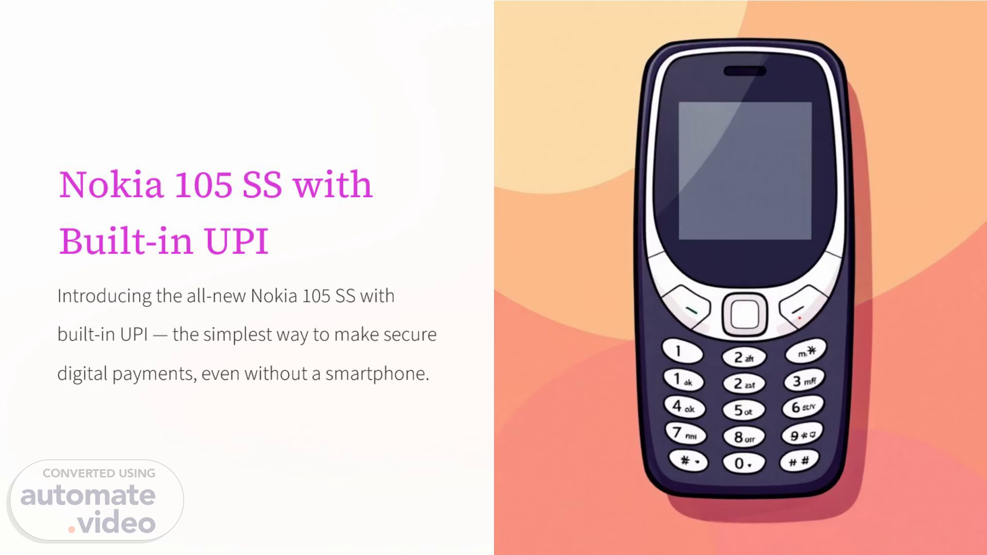 [Audio] Order Today Start making UPI payments with your Nokia 105 SS Order today and start making UPI payments with your Nokia 105 SS. We are proud to introduce the Nokia 105 SS, a feature phone that takes the hassle out of digital payments with its built-in UPI capability. Imagine being able to make secure transactions, even without a smartphone. This revolutionary device empowers users to take control of their financial lives, ensuring a seamless experience. With its user-friendly interface, making UPI payments has never been easier. We invite you to experience the future of mobile payments with the Nokia 105 SS. Order today and start making UPI payments with your Nokia 105 SS. Thank you. ..