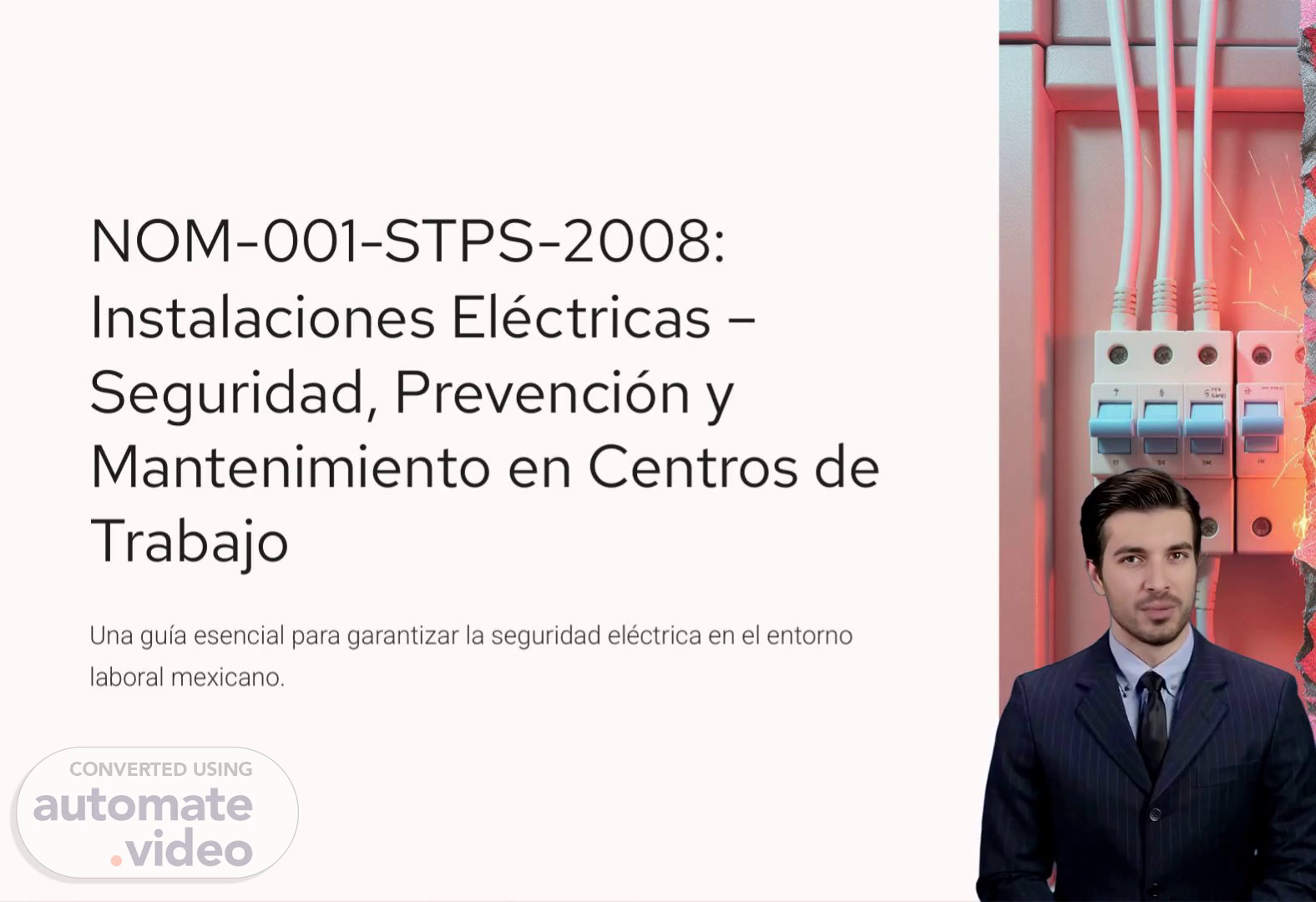 [Virtual Presenter] Bienvenidos a esta presentación acerca de la NOM-001-STPS-2008, una guía esencial para garantizar la seguridad eléctrica en los centros de trabajo en México. Esta norma establece requisitos y medidas para prevenir riesgos en las instalaciones eléctricas y promover un mantenimiento adecuado para asegurar un ambiente laboral seguro. En esta presentación, nos enfocaremos en el capítulo 3 de la norma, que se enfoca específicamente en las instalaciones eléctricas. En este capítulo, se establecen lineamientos para la instalación, operación y mantenimiento de equipos y sistemas eléctricos, así como medidas de seguridad necesarias para prevenir accidentes. Es importante destacar que la seguridad eléctrica es un aspecto fundamental en los entornos laborales, ya que el uso inadecuado de las instalaciones eléctricas puede causar accidentes graves e incluso poner en riesgo la vida de los trabajadores. Por eso, es vital seguir las indicaciones de la NOM-001-STPS-2008 para garantizar la protección de los trabajadores y el correcto funcionamiento de las instalaciones eléctricas. Recuerden que el cumplimiento de esta norma es obligatorio y puede ser verificado durante inspecciones de las autoridades laborales. Por lo tanto, es responsabilidad de todos los empleadores cumplir con los requisitos establecidos en la NOM-001-STPS-2008. Continuemos con la presentación y exploremos más a fondo la importancia de esta norma y cómo podemos aplicarla en nuestros centros de trabajo para garantizar un entorno laboral más seguro. ¡Sigamos adelante!.