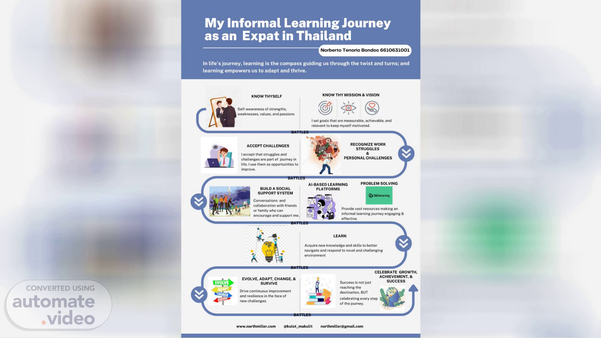 I am North. Sorry for not coming in class today due to my Saturday teaching obligation. By the way, I am using a voice changer app just for fun. Here is my informal learning journey as an expat in Thailand. May I present to you my informal learning journey as an expat in Thailand. To start, let me share a personal quote: "In life’s journey, learning is the compass guiding us through the twists and turns; learning empowers us to adapt and thrive." This means that no matter the challenges or unexpected changes we face, our ability to learn and grow helps us navigate and succeed. In this learning journey map, the curve line represents my learning path. As I embark on this path, battles and hurdles will always be there. The curve line, resembling the letter U and a roller coaster rail, symbolizes the ups and downs in my learning journey. I begin with "Know Thyself." Self-awareness of my strengths, weaknesses, values, and passions is crucial. Understanding who I am lays the foundation for my journey.Next is "Know Thy Mission & Vision." Setting measurable, achievable, and relevant goals keeps me motivated and focused on my path.Recognizing work struggles and personal challenges is essential. Accepting that struggles and challenges are part of life, I use them as opportunities to improve.Building a social support system is vital. Conversations and collaboration with friends or family who can encourage and support me are essential. Conversations are the stem cells of learning. In my learning path, finding ways to resolve problems is is life saving. Problem-solving and AI-based learning platforms such 360 learning LMS play a crucial role. They provide vast resources, making an informal learning journey engaging and effective. Learning is about acquiring new knowledge and skills to better navigate and respond to novel and challenging environments. Next is Evolve, adapt, change, and survive. These drive continuous improvement and resilience in the face of novel and challenging workplace environment Then I take a moment to celebrate growth, achievement, and success. For me, success is not just about reaching the destination; it’s about celebrating every step of the journey. Each challenge I overcome, each skill I master, and each milestone I reach is a testament to my dedication and resilience. I recognize the progress I’ve made, no matter how small it may seem. Every step forward is a victory. I celebrate my growth and the achievements along the way, for they are the building blocks of my success. As I continue my learning journey, I remind myself to acknowledge and celebrate these moments. They remind me of my capacity to learn, adapt, and thrive. Finally, the five core takeaways that are crucial for us as L&D innovators to make a significant impact. First, Embrace a user-centric approach. By prioritizing the needs and experiences of our learners, we can create training programs that are not only relevant but also engaging. This focus on the learner’s journey ensures that our efforts lead to meaningful and effective learning experiences. Second, Foster a culture of continuous learning. Encouraging ongoing learning helps our employees stay up-to-date with the latest skills and knowledge. By promoting a culture where learning never stops, we keep our workforce adaptable and innovative. Then Leverage technology and innovation. Using advanced tools and platforms can greatly enhance learning experiences and make them more accessible. As L&D innovators, integrating technology into our training solutions will enable us to reach a wider audience in more dynamic ways. Next is Collaboration and knowledge sharing are essential. Creating opportunities for employees to learn from each other fosters a collaborative and supportive environment. Facilitating peer-to-peer learning and teamwork helps us harness collective expertise and improve our problem-solving capabilities. Last is to Measure and evaluate learning outcomes. Regular assessment of training effectiveness helps us refine and improve our learning strategies. By implementing robust evaluation methods, we can ensure that our L&D initiatives are aligned with organizational goals and deliver measurable results. In conclusion, Incorporating these core takeaways into our L&D practices will not only enhance our training programs but also drive innovation and growth within our organizations. Thank you for joining me today, and I look forward to seeing the impact we can make as L&D innovators. Remember, learning is our compass through life’s twists and turns. Embrace it, and you’ll adapt and thrive. Until next time, keep learning and growing.