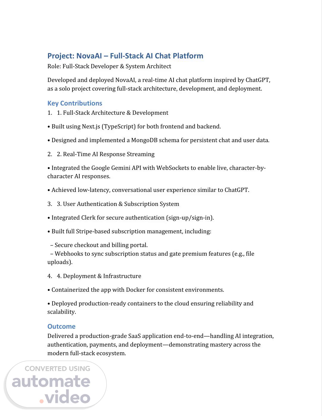 Project: NovaAI – Full-Stack AI Chat Platform Role: Full-Stack Developer & System Architect Developed and deployed NovaAI, a real-time AI chat platform inspired by ChatGPT, as a solo project covering full-stack architecture, development, and deployment. Key Contributions 1. 1. Full-Stack Architecture & Development • Built using Next.js (TypeScript) for both frontend and backend. • Designed and implemented a MongoDB schema for persistent chat and user data. 2. 2. Real-Time AI Response Streaming • Integrated the Google Gemini API with WebSockets to enable live, character-by- character AI responses. • Achieved low-latency, conversational user experience similar to ChatGPT. 3. 3. User Authentication & Subscription System • Integrated Clerk for secure authentication (sign-up/sign-in). • Built full Stripe-based subscription management, including: – Secure checkout and billing portal. – Webhooks to sync subscription status and gate premium features (e.g., file uploads). 4. 4. Deployment & Infrastructure • Containerized the app with Docker for consistent environments. • Deployed production-ready containers to the cloud ensuring reliability and scalability. Outcome Delivered a production-grade SaaS application end-to-end—handling AI integration, authentication, payments, and deployment—demonstrating mastery across the modern full-stack ecosystem..