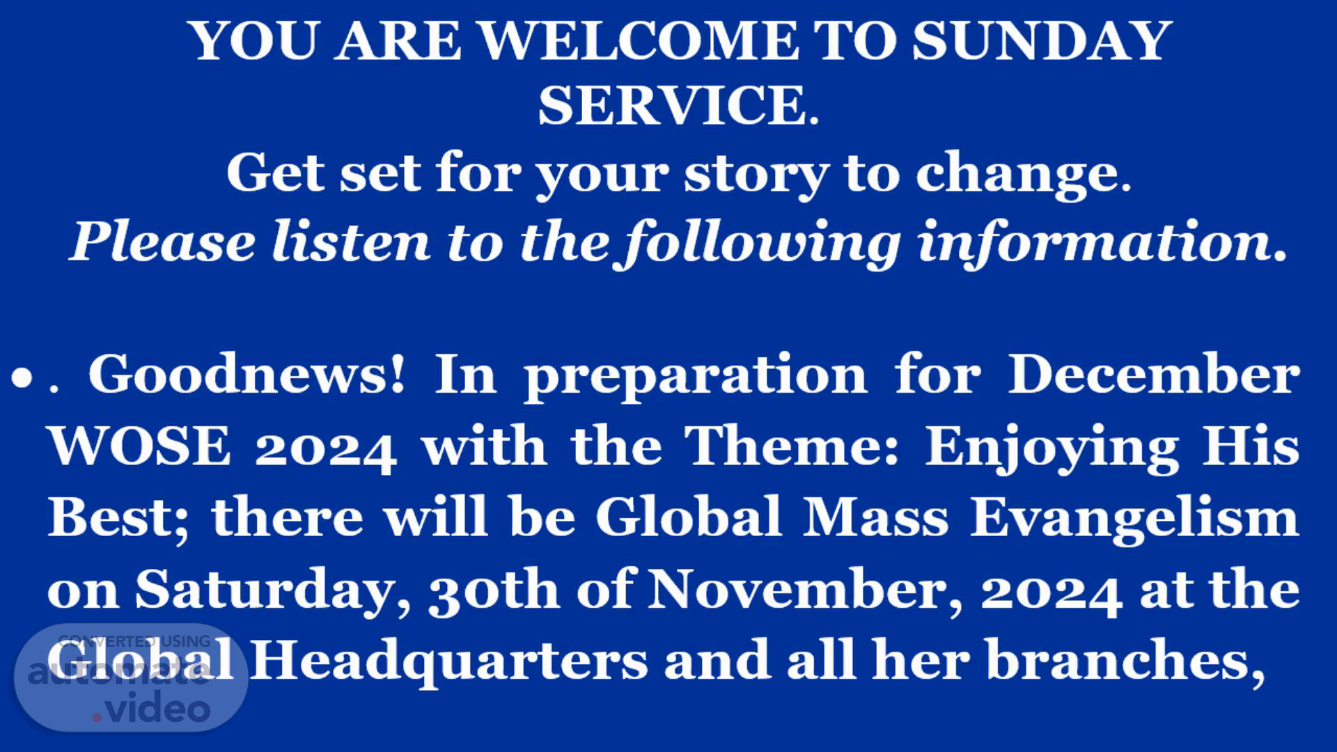 [Audio] YOU ARE WELCOME TO SUNDAY SERVICE. Get set for your story to change. Please listen to the following information. . Goodnews! In preparation for December WOSE 2024 with the Theme: Enjoying His Best; there will be Global Mass Evangelism on Saturday, 30th of November, 2024 at the Global Headquarters and all her branches,.