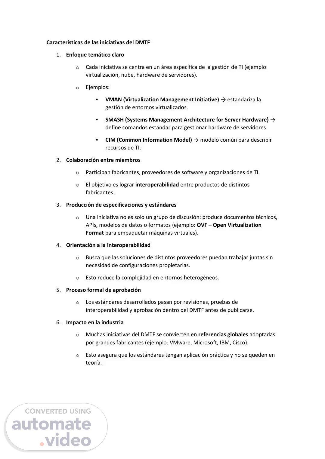 [Audio] Características de las iniciativas del DMTF 1. Enfoque temático claro o Cada iniciativa se centra en un área específica de la gestión de TI (ejemplo: virtualización, nube, hardware de servidores). o Ejemplos:  VMAN (Virtualization Management Initiative) → estandariza la gestión de entornos virtualizados.  SMASH (Systems Management Architecture for Server Hardware) → define comandos estándar para gestionar hardware de servidores.  CIM (Common Information Model) → modelo común para describir recursos de TI. 2. Colaboración entre miembros o Participan fabricantes, proveedores de software y organizaciones de TI. o El objetivo es lograr interoperabilidad entre productos de distintos fabricantes. 3. Producción de especificaciones y estándares o Una iniciativa no es solo un grupo de discusión: produce documentos técnicos, APIs, modelos de datos o formatos (ejemplo: OVF – Open Virtualization Format para empaquetar máquinas virtuales). 4. Orientación a la interoperabilidad o Busca que las soluciones de distintos proveedores puedan trabajar juntas sin necesidad de configuraciones propietarias. o Esto reduce la complejidad en entornos heterogéneos. 5. Proceso formal de aprobación o Los estándares desarrollados pasan por revisiones, pruebas de interoperabilidad y aprobación dentro del DMTF antes de publicarse. 6. Impacto en la industria o Muchas iniciativas del DMTF se convierten en referencias globales adoptadas por grandes fabricantes (ejemplo: VMware, Microsoft, IBM, Cisco). o Esto asegura que los estándares tengan aplicación práctica y no se queden en teoría..