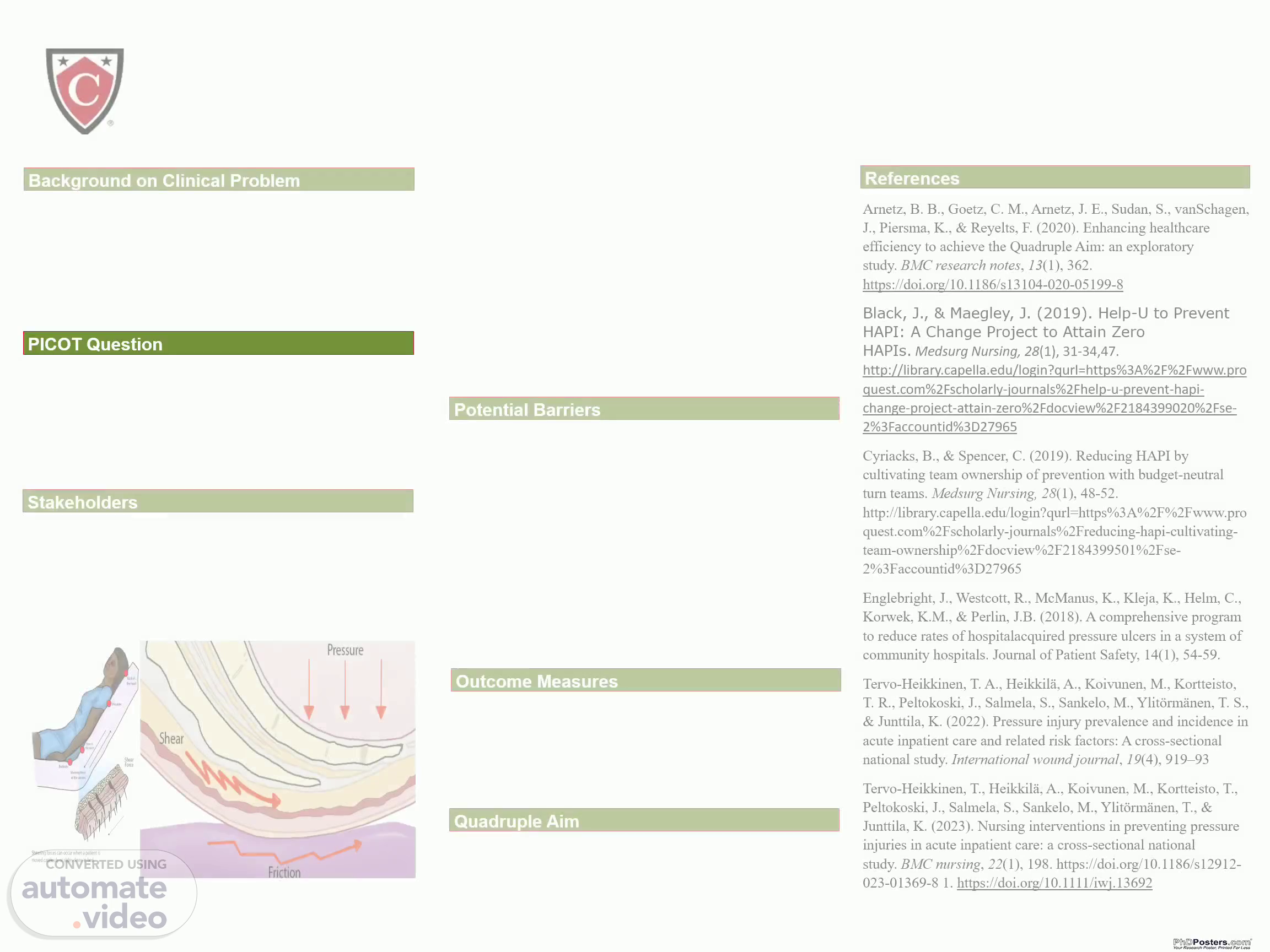 [Audio] Hospital-acquired pressure injuries on two medical-surgical units were identified as financial and patient outcome concerns (Black, 2019). There is currently a process in place for repositioning the patient every two hours, but it is not always performed. PICOT questions are the following; In adult inpatients (P), does the implementation of a comprehensive pressure injury prevention program by nurses (I), compared to standard pressure injury prevention practices (C), result in a reduction in the occurrence of pressure injuries (O) during the hospital stay (T)? Stakeholders include inpatient nurse, patient care tech, physicians, wound care nurse, charge nurse/ floor managers. Action plans would include skin inspection within 8 hours upon admission, every time there is a change in condition, and prior to discharge from the hospital, the Braden risk scoring tool would be utilized for every shift change, daily auditing documentation of patient repositioning, yearly hospital acquired pressure injury education for nurses and CNAs, assessing malnutrition within a week of admission. The suggested action plans are logical and achievable because they are consistent with recognized best practices for enhancing patient safety, reducing problems, and delivering adequate treatment. They promote early detection, prompt action, education, and preventative measures to enhance patient outcomes and treatment quality. Potential Barriers include resistance to change. To mitigate this, engage stakeholders early in the process and address concerns. The second is a lack of clear expectations. To mitigate this, the administration should set clear goals and objectives. The third is a lack of resources. To mitigate this, assess resources and identify any gaps and limitations. The fourth is a lack of communication. To solve this, provide regular updates. Lastly, is the misunderstanding of the evidence related to pressure injuries. The organization can provide continuing education and training to resolve this. Outcome Measures: Current pressure injury data is 5 hospital acquired pressure injury cases per 1,000 patient days, cases down to three cases in one month, pressure injury cases are down to two in 3 months and hospital acquired pressure injury cases down to 1 case in 6 months. The outcome measurements motivate team members to offer high-quality treatment and a great patient experience. While a productivity emphasis needs outputs and puts pressure on stakeholders to produce results, an efficiency focus deals with modification of processes and necessitates organizational transformation. Thus, ideally, a focus on efficiency should enable staff to accomplish performance metrics while boosting workplace well-being since resources and procedures are more efficient, and team members are working at the top of their abilities. For the Quadruple Aim, patient experience improved, population health improved, healthcare costs were reduced, and health care provider work lives were evaluated and improved. Hospital-acquired pressure injuries affect 1 in 30 patients and cause 60,000 fatalities annually (Englebright et al., 2018). In conclusion, pressure redistribution, team collaboration, and improved education should be routinely used to control hospital acquired pressure injury risk in acute hospitals. Implementing evidence-based practices and involving stakeholders promotes teamwork and communication. One way to avoid Hospital-acquired pressure injuries is to improve movement, nutrition and address conditions that cause immobility and pressure. Collecting data allows for the application of performance metrics, such as incidence rate per 1,000 patient days, to monitor progress and suggest areas for improvement..