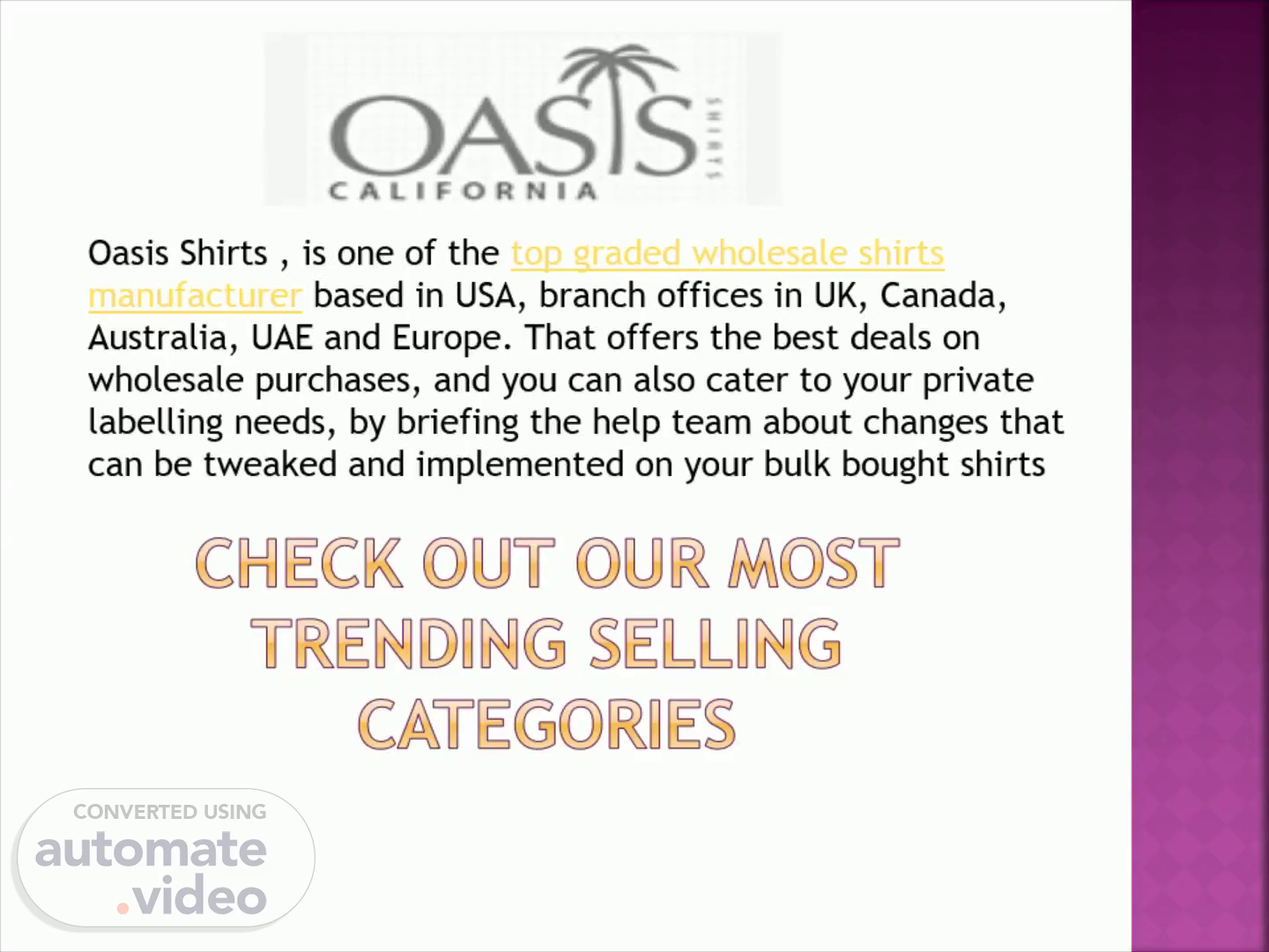 Check out Our Most Trending Selling Categories. Oasis Shirts , is one of the top graded wholesale shirts manufacturer based in USA, branch offices in UK, Canada, Australia, UAE and Europe. That offers the best deals on wholesale purchases, and you can also cater to your private labelling needs, by briefing the help team about changes that can be tweaked and implemented on your bulk bought shirts.