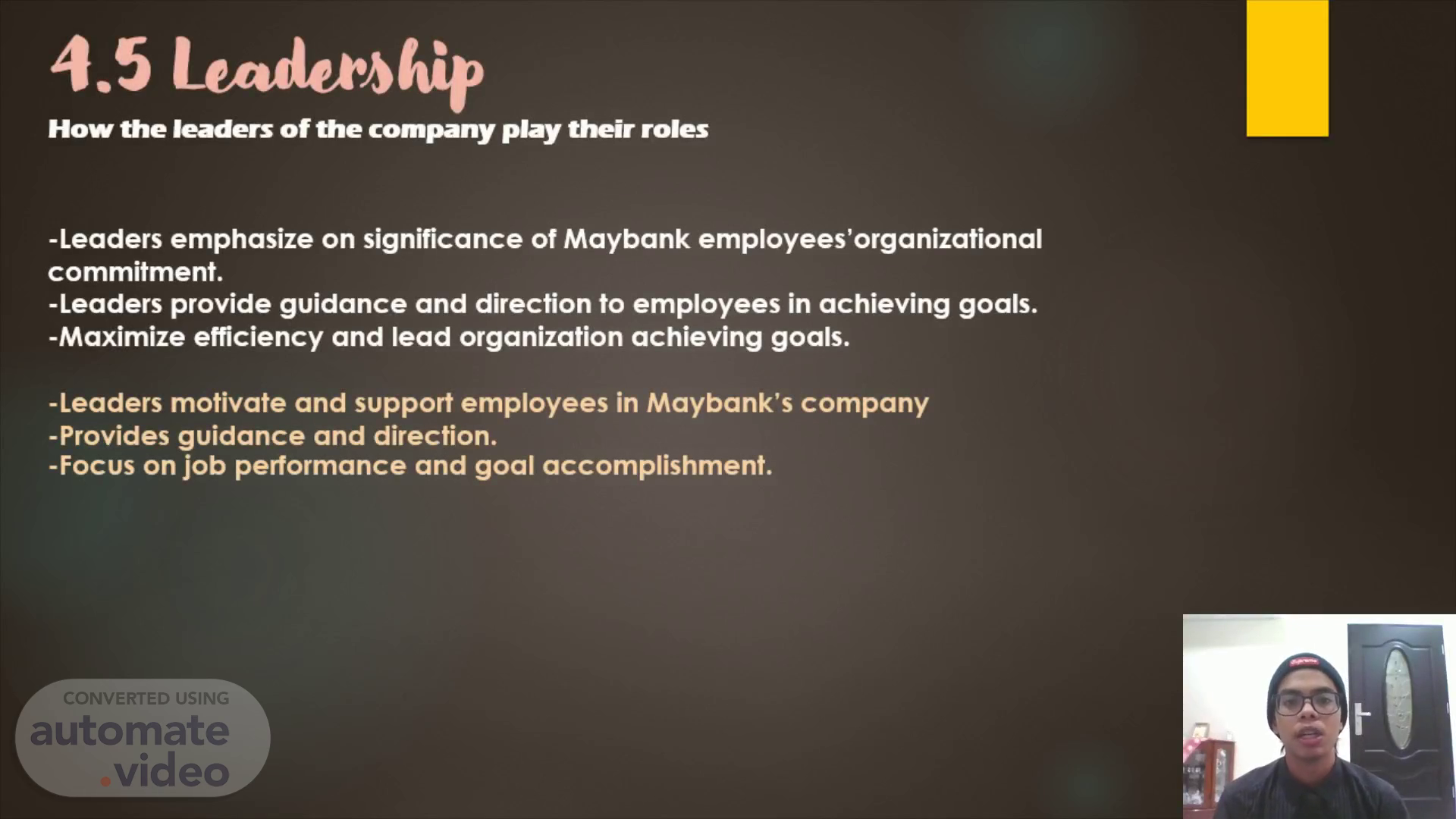 4.5 Leadership How the leaders of the company play their roles -Leaders emphasize on significance of Maybank employees'organizational commitment. -Leaders provide guidance and direction to employees in achieving goals. -Maximize efficiency and lead