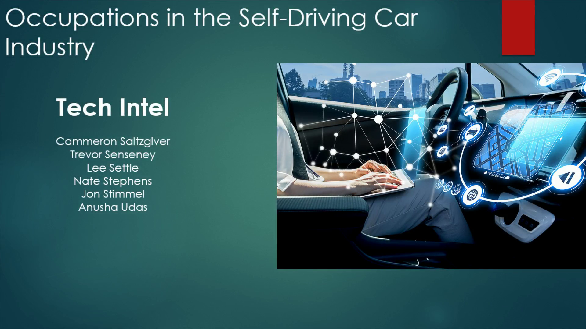 [Audio] Good Morning, Afternoon, Evening Class and Professor, we will presenting Tech Intel's brief on Self-driving cars. Tech Intel comprises of Cammeron Saltzgiver, Trevor Senseney, Lee Settle, Nate Stephens, Jon Stimmel, and Anusha Udas..