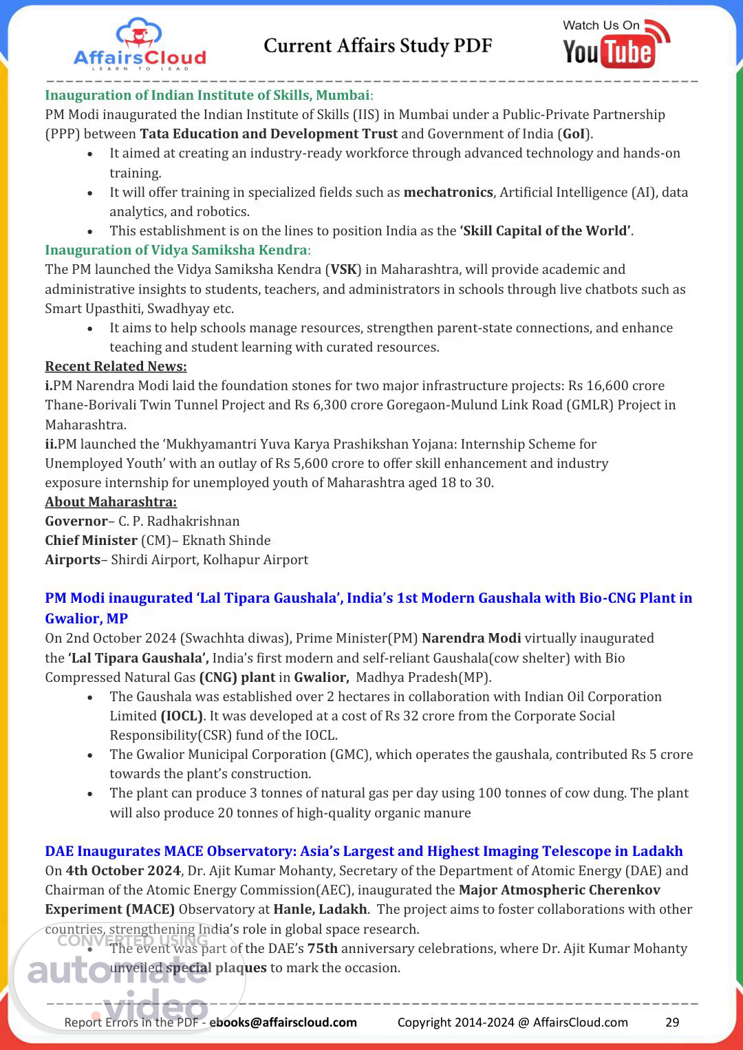 [Virtual Presenter] Inauguration of Indian Institute of Skills, Mumbai: PM Modi inaugurated the Indian Institute of Skills (I-I-S--) in Mumbai under a Public Private Partnership (P-P-P--) between Tata Education and Development Trust and Government of India (GoI). It aimed at creating an industry ready workforce through advanced technology and hands on training. It will offer training in specialized fields such as mechatronics, Artificial Intelligence (A-I---), data analytics, and robotics. This establishment is on the lines to position India as the ‘Skill Capital of the World’. Inauguration of Vidya Samiksha Kendra: The PM launched the Vidya Samiksha Kendra (V-S-K--) in Maharashtra, will provide academic and administrative insights to students, teachers, and administrators in schools through live chatbots such as Smart Upasthiti, Swadhyay et cetera It aims to help schools manage resources, strengthen parent state connections, and enhance teaching and student learning with curated resources. Recent Related News: i.PM Narendra Modi laid the foundation stones for two major infrastructure projects: Rs 16600 crore Thane Borivali Twin Tunnel Project and Rs 6300 crore Goregaon Mulund Link Road (G-M-L-R-) Project in Maharashtra. ii.PM launched the ‘Mukhyamantri Yuva Karya Prashikshan Yojana: Internship Scheme for Unemployed Youth’ with an outlay of Rs 5600 crore to offer skill enhancement and industry exposure internship for unemployed youth of Maharashtra aged 18 to 30. About Maharashtra: Governor– C P Radhakrishnan Chief Minister (C-M---)– Eknath Shinde Airports– Shirdi Airport, Kolhapur Airport PM Modi inaugurated ‘Lal Tipara Gaushala’, India’s 1st Modern Gaushala with Bio C-N-G Plant in Gwalior, MP On 2nd October 2024 (Swachhta diwas), Prime Minister(P-M---) Narendra Modi virtually inaugurated the ‘Lal Tipara Gaushala’, India’s first modern and self reliant Gaushala(cow shelter) with Bio Compressed Natural Gas (C-N-G--) plant in Gwalior, Madhya Pradesh(M-P---). The Gaushala was established over 2 hectares in collaboration with Indian Oil Corporation Limited (I-O-C-L-).It was developed at a cost of Rs 32 crore from the Corporate Social Responsibility(C-S-R--) fund of the IOCL. The Gwalior Municipal Corporation (G-M-C--), which operates the gaushala, contributed Rs 5 crore towards the plant’s construction. The plant can produce 3 tonnes of natural gas per day using 100 tonnes of cow dung. The plant will also produce 20 tonnes of high quality organic manure D-A-E Inaugurates mace Observatory: Asia’s Largest and Highest Imaging Telescope in Ladakh On 4th October 2024, Dr Ajit Kumar Mohanty, Secretary of the Department of Atomic Energy (D-A-E--) and Chairman of the Atomic Energy Commission(A-E-C--), inaugurated the Major Atmospheric Cherenkov Experiment (M-A-C-E-) Observatory at Hanle, Ladakh. The project aims to foster collaborations with other countries, strengthening India’s role in global space research. The event was part of the DAE’s 75th anniversary celebrations, where Dr Ajit Kumar Mohanty unveiled special plaques to mark the occasion. Report Errors in the P-D-F [email protected] Copyright 2014-2024 @ AffairsCloud.com 29.