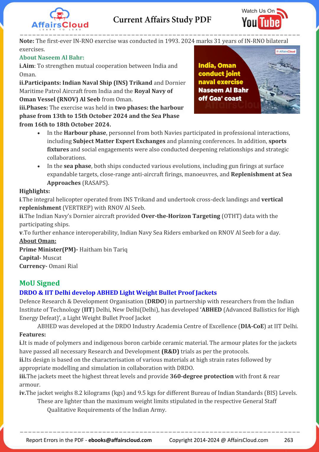 [Virtual Presenter] Note: The first ever IN-RNO exercise was conducted in 1993. 2024 marks 31 years of IN-RNO bilateral exercises. About Naseem Al Bahr: i.Aim: To strengthen mutual cooperation between India and Oman. ii.Participants: Indian Naval Ship (I-N-S--) Trikand and Dornier Maritime Patrol Aircraft from India and the Royal Navy of Oman Vessel (R-N-O-V-) Al Seeb from Oman. iii.Phases: The exercise was held in two phases: the harbour phase from 13th to 15th October 2024 and the Sea Phase from 16th to 18th October 2024. In the Harbour phase, personnel from both Navies participated in professional interactions, including Subject Matter Expert Exchanges and planning conferences. In addition, sports fixtures and social engagements were also conducted deepening relationships and strategic collaborations. In the sea phase, both ships conducted various evolutions, including gun firings at surface expandable targets, close range anti aircraft firings, manoeuvres, and Replenishment at Sea Approaches (RASAPS). Highlights: i.The integral helicopter operated from I-N-S Trikand and undertook cross deck landings and vertical replenishment (VERTREP) with R-N-O-V Al Seeb. ii.The Indian Navy’s Dornier aircraft provided Over the Horizon Targeting (O-T-H-T-) data with the participating ships. v.To further enhance interoperability, Indian Navy Sea Riders embarked on R-N-O-V Al Seeb for a day. About Oman: Prime Minister(P-M---) Haitham bin Tariq Capital Muscat Currency Omani Rial MoU Signed DRDO & I-I-T Delhi develop A-B-H-E-D Light Weight Bullet Proof Jackets Defence Research & Development Organisation (D-R-D-O-) in partnership with researchers from the Indian Institute of Technology (I-I-T--) Delhi, New Delhi(Delhi), has developed ‘ABHED (Advanced Ballistics for High Energy Defeat)’, a Light Weight Bullet Proof Jacket A-B-H-E-D was developed at the D-R-D-O Industry Academia Centre of Excellence (DIA-CoE) at I-I-T Delhi. Features: i.It is made of polymers and indigenous boron carbide ceramic material.The armour plates for the jackets have passed all necessary Research and Development (R&D) trials as per the protocols. ii.Its design is based on the characterisation of various materials at high strain rates followed by appropriate modelling and simulation in collaboration with DRDO. iii.The jackets meet the highest threat levels and provide 360-degree protection with front & rear armour. iv.The jacket weighs 8.2 kilograms (kgs) and 9.5 kilogramss for different Bureau of Indian Standards (B-I-S--) Levels. These are lighter than the maximum weight limits stipulated in the respective General Staff Qualitative Requirements of the Indian Army. Report Errors in the P-D-F [email protected] Copyright 2014-2024 @ AffairsCloud.com 263.