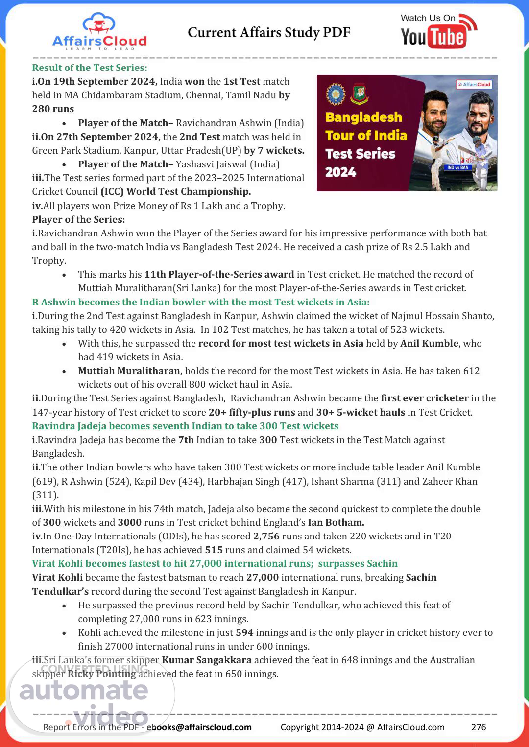 [Virtual Presenter] R Ashwin (524), Kapil Dev (434), Harbhajan Singh (417), Ishant Sharma (311) and Zaheer Khan (311). iii.With his milestone in his 74th match, Jadeja also became the second quickest to complete the double of 300 wickets and 3000 runs in Test cricket behind England’s Ian Botham. iv.In One Day Internationals (ODIs), he has scored 2756 runs and taken 220 wickets and in T-2-0 Internationals (T20Is), he has achieved 515 runs and claimed 54 wickets. Virat Kohli becomes fastest to hit 27000 international runs; surpasses Sachin Virat Kohli became the fastest batsman to reach 27000 international runs, breaking Sachin Tendulkar’s record during the second Test against Bangladesh in Kanpur. He surpassed the previous record held by Sachin Tendulkar, who achieved this feat of completing 27000 runs in 623 innings. Kohli achieved the milestone in just 594 innings and is the only player in cricket history ever to finish 27000 international runs in under 600 innings. iii.Sri Lanka’s former skipper Kumar Sangakkara achieved the feat in 648 innings and the Australian skipper Ricky Pointing achieved the feat in 650 innings. Report Errors in the P-D-F [email protected] Copyright 2014-2024 @ AffairsCloud.com 276.