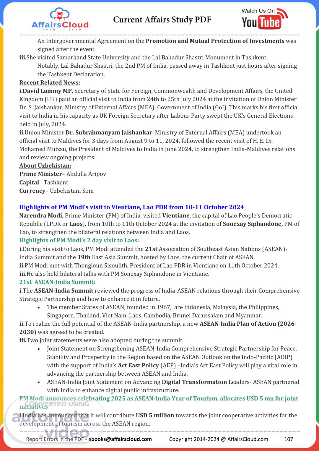 [Virtual Presenter] An Intergovernmental Agreement on the Promotion and Mutual Protection of Investments was signed after the event. iii.She visited Samarkand State University and the Lal Bahadur Shastri Monument in Tashkent. Notably, Lal Bahadur Shastri, the 2nd PM of India, passed away in Tashkent just hours after signing the Tashkent Declaration. Recent Related News: i.David Lammy MP, Secretary of State for Foreign, Commonwealth and Development Affairs, the United Kingdom (U-K---) paid an official visit to India from 24th to 25th July 2024 at the invitation of Union Minister Dr S Jaishankar, Ministry of External Affairs (M-E-A--), Government of India (GoI). This marks his first official visit to India in his capacity as UK Foreign Secretary after Labour Party swept the UK’s General Elections held in July, 2024. ii.Union Minister Dr Subrahmanyam Jaishankar, Ministry of External Affairs (M-E-A--) undertook an official visit to Maldives for 3 days from August 9 to 11, 2024, followed the recent visit of H E Dr Mohamed Muizzu, the President of Maldives to India in June 2024, to strengthen India Maldives relations and review ongoing projects. About Uzbekistan: Prime Minister– Abdulla Aripov Capital– Tashkent Currency– Uzbekistani Som Highlights of PM Modi’s visit to Vientiane, Lao P-D-R from 10-11 October 2024 Narendra Modi, Prime Minister (P-M---) of India, visited Vientiane, the capital of Lao People’s Democratic Republic (LPDR or Laos), from 10th to 11th October 2024 at the invitation of Sonexay Siphandone, PM of Lao, to strengthen the bilateral relations between India and Laos. Highlights of PM Modi’s 2 day visit to Laos: i.During his visit to Laos, PM Modi attended the 21st Association of Southeast Asian Nations (A-S-E-A-N)India Summit and the 19th East Asia Summit, hosted by Laos, the current Chair of asean. ii.PM Modi met with Thongloun Sisoulith, President of Lao P-D-R in Vientiane on 11th October 2024. iii.He also held bilateral talks with PM Sonexay Siphandone in Vientiane.21st asean India Summit: i.The asean India Summit reviewed the progress of India asean relations through their Comprehensive Strategic Partnership and how to enhance it in future. The member States of asean, founded in 1967, are Indonesia, Malaysia, the Philippines, Singapore, Thailand, Viet Nam, Laos, Cambodia, Brunei Darussalam and Myanmar. ii.To realize the full potential of the asean India partnership, a new asean India Plan of Action (20262030) was agreed to be created. iii.Two joint statements were also adopted during the summit. Joint Statement on Strengthening asean India Comprehensive Strategic Partnership for Peace, Stability and Prosperity in the Region based on the asean Outlook on the Indo Pacific (A-O-I-P-) with the support of India’s Act East Policy (A-E-P--) –India’s Act East Policy will play a vital role in advancing the partnership between asean and India. asean India Joint Statement on Advancing Digital Transformation Leaders asean partnered with India to enhance digital public infrastructure. PM Modi announces celebrating 2025 as asean India Year of Tourism, allocates USD 5 mn for joint initiatives i.India has announced that it will contribute USD 5 million towards the joint cooperative activities for the development of tourism across the asean region. Report Errors in the P-D-F [email protected] Copyright 2014-2024 @ AffairsCloud.com 107.
