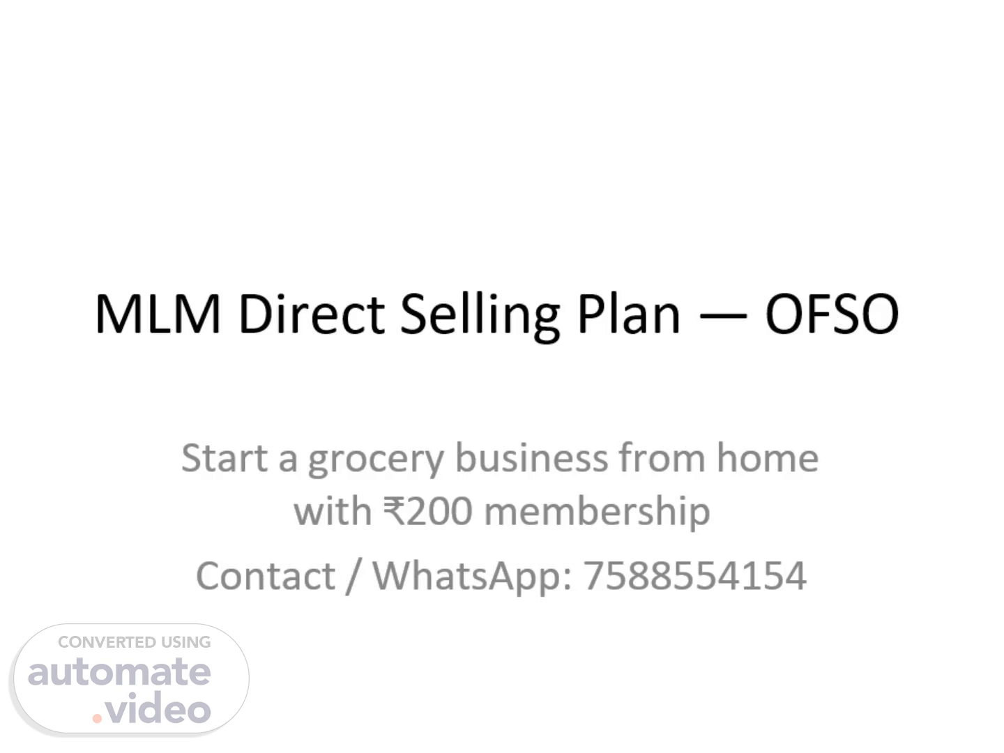 [Audio] Welcome to the MLM Direct Selling Plan presentation for OFSO. In this presentation, we will discuss the process of starting your own grocery business from the comfort of your home with a one-time investment of ₹200. This includes opportunities for earning bonuses through sign-ups and repurchases, as well as a comprehensive rank structure that has the potential to generate a significant income. Additionally, we provide a range of tools and resources to support your success. Let's now delve into the details and discover how OFSO can assist you in achieving your entrepreneurial goals. If you have any inquiries or require further information, please feel free to contact us via WhatsApp at 7588554154. Let's begin!.