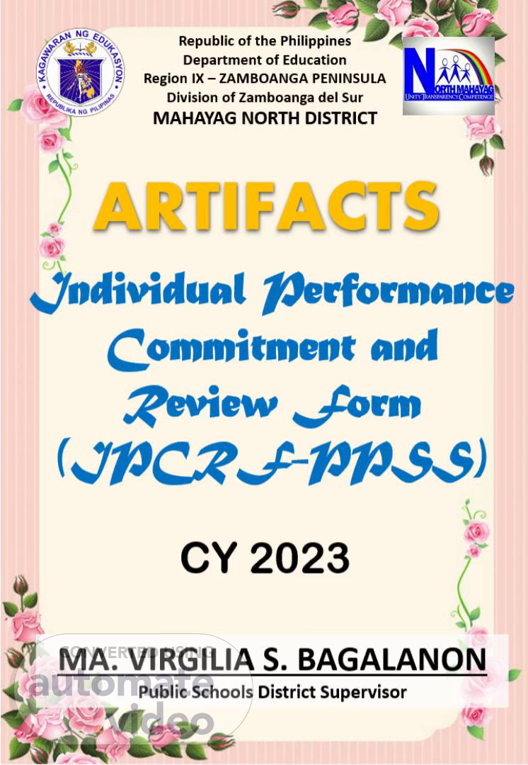 [Audio] Republic of the Philippines Department of Education Region IX – ZAMBOANGA PENINSULA Division of Zamboanga del Sur MAHAYAG NORTH DISTRICT MA. VIRGILIA S. BAGALANON Public Schools District Supervisor ARTIFACTS Individual Performance Commitment and Review Form (IPCRF-PPSS) CY 2023 Individual Performance Commitment and Review Form (IPCRF-PPSS).