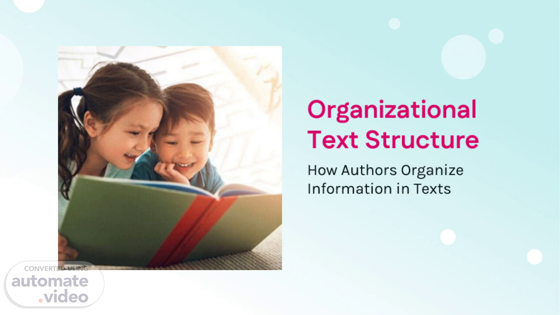 [Audio] Welcome, everyone. Today, our discussion will cover organizational text structures and how authors use them to present information clearly and in an organized manner. By understanding these structures, readers can better comprehend the presented information. In this presentation, we will also examine important vocabulary and clue words that can assist in identifying different text structures. Let's begin and discover more about how authors organize their writing. Thank you for joining me..