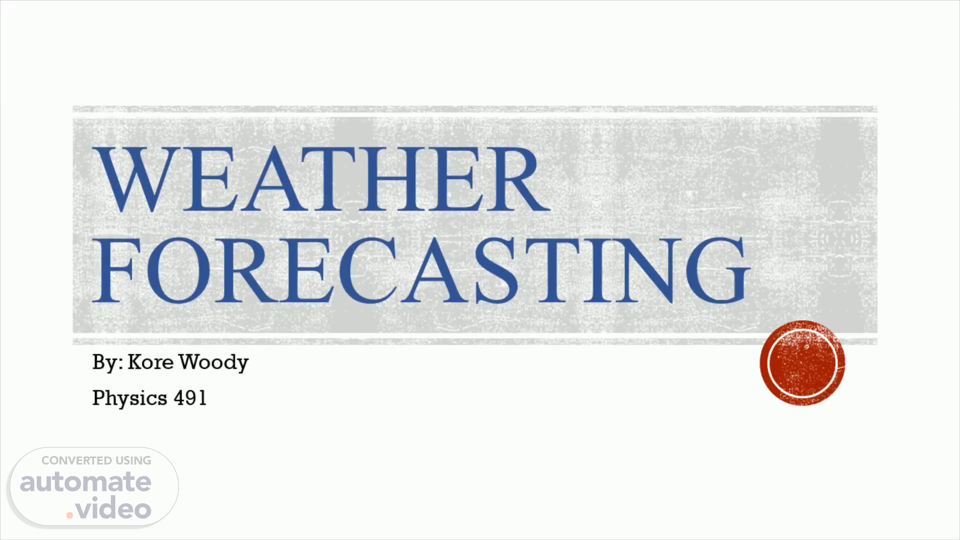 [Audio] I will begin with the elements of weather prediction with a brief review of its history. I will then cover different models and methods for forecasting. I will conclude with the results of my own model via MATLAB..