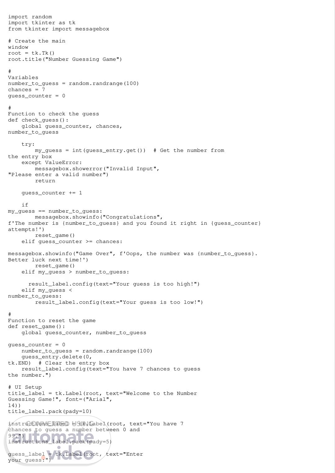 guess_label.pack() guess_entry = tk.Entry(root, width=10) guess_entry.pack(pady=5) submit_button = tk.Button(root, text="Submit Guess", command=check_guess) submit_button.pack(pady=10) result_label = tk.Label(root, text="Good luck!", font=("Arial", 12)) result_label.pack(pady=10) # Start the GUI event loop root.mainloop() Powered by TCPDF (www.tcpdf.org).