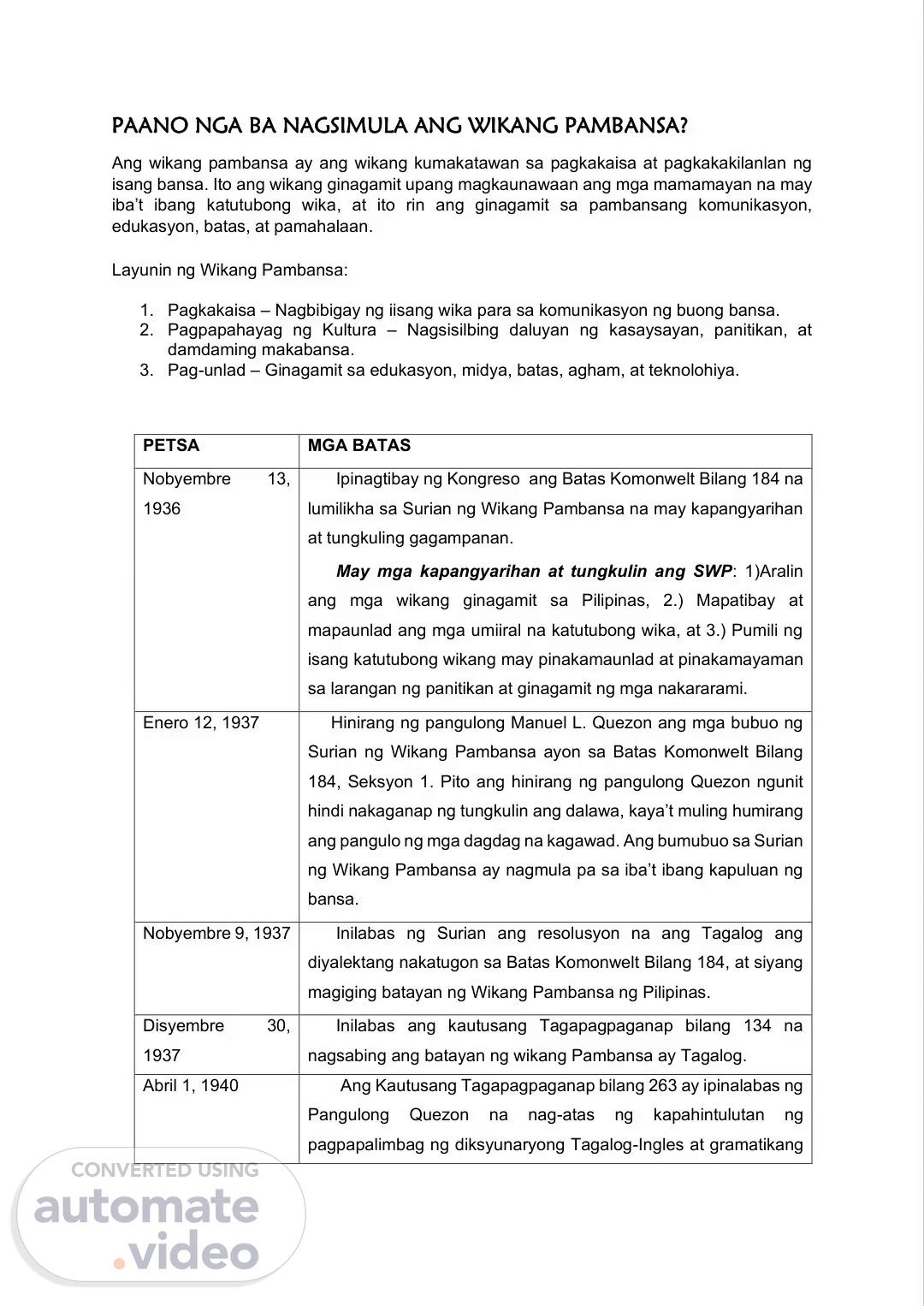 [Audio] This presentation will discuss the origins of our national language and the key dates and laws that contributed to its establishment. The national language represents the unity and identity of our country, serving as a means of communication among people with different native languages and used in various aspects of national life such as education, laws, and government. Its main objectives are unity, cultural expression, and progress, providing a common language for the entire country and promoting national pride. The Institute of the National Language was created by Commonwealth Act No. 184 on November 13, 1936. It was responsible for studying and developing the languages used in the Philippines, strengthening and enriching native languages, and selecting one language with the most developed literature for national use. On January 12, 1937, President Quezon appointed the members of the Institute, with two additional members later appointed. These members came from different islands of the country. On November 9, 1937, the Institute passed a resolution declaring Tagalog as the basis for the national language, as stated in Commonwealth Act No. 184. On December 30, 1937, Presidential Executive Order No. 134 was issued, officially declaring Tagalog as the basis for the national language. President Quezon also authorized the publication of a Tagalog-English dictionary and grammar book through Presidential Executive Order No. 263 on April 1, 1940. These key dates and laws were crucial in the development and establishment of our national language, which unifies us as a nation. Thank you for watching..