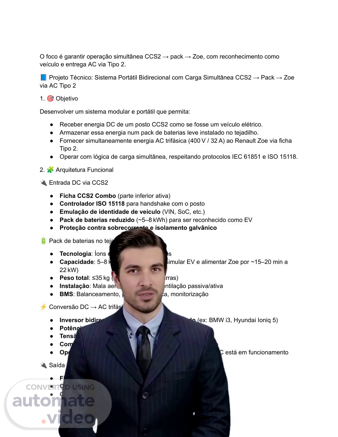 [Virtual Presenter] O objetivo do projeto é desenvolver um sistema portável e modular que permita receber energia DC de um posto CCS2 como se fosse um veículo elétrico, armazenar essa energia em um pacote de baterias leve instalado no tejadilho, e fornecer energia AC trifásica (400 V / 32 A) ao Renault Zoe via fiche Tipo 2. O sistema deve operar com lógica de carga simultânea, respeitando os protocolos IEC 61851 e ISO 15118. A arquitetura funcional do sistema inclui uma entrada DC via CCS2, uma fiche CCS2 Combo (parte inferior ativa), um controlador ISO 15118 para handshake com o posto, uma emulação de identidade de veículo (VIN, SoC, etc.), um pacote de baterias reduzido (~5-8 kWh) para ser reconhecido como EV, proteção contra sobrecorrente e isolamento galvânico, e um pacote de baterias instalado no tejadilho. O sistema utiliza tecnologias de íons de lítio, módulos planos, capacidade de 5-8 kWh (suficiente para simular EV e alimentar Zoe por ~15-20 minutos a 22 kW), peso total de <=35 kg (incluindo mala e barras), instalação em uma mala aerodinâmica com ventilação passiva/ativa, e um BMS (Balanceamento, proteção térmica, monitorização). Além disso, a conversão DC → AC trifásica é realizada através de uma tecnologia de conversão de alta eficiência..